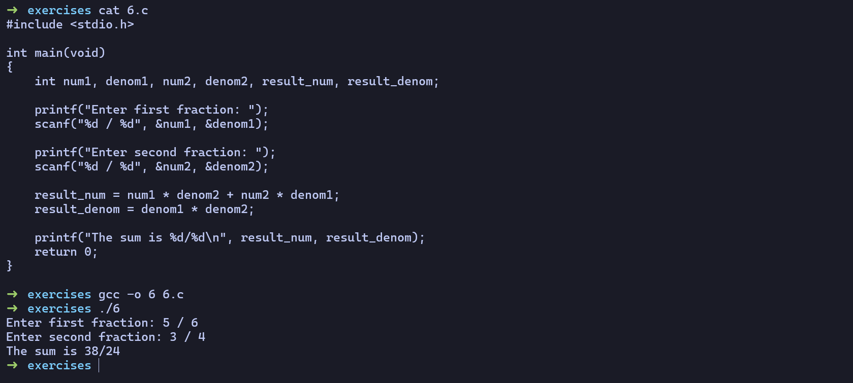 int num1, denom1, num2, denom2, result_num, result_denom;