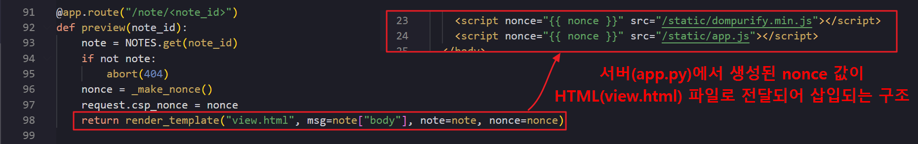 여기서 <script id="errorReporterScript" src="공격자가 설정한 임의의 JS 파일 경로"> 에 “nonce” 값이 없음에도 정상적으로 공격자의 악성 파일이 로드되는 이유는 ‘strict-dynamic’ 설정 때문입니다. app.js 파일은 view.html 파일이 브라우저에 렌더링 될 때 스크립트 태그(<script nonce="{...}" src="/static/app.js">)에 의해 서버로부터 가져오는 파일인데요. 이 파일은 이미 “nonce” 값이 설정된 스크립트 태그에 의해 로드된 파일이기 때문에 이로부터 생성된 스크립트들은 모두 “신뢰된(trusted) 스크립트”로 인식되어 제한없이 스크립트를 실행할 수 있게 됩니다.