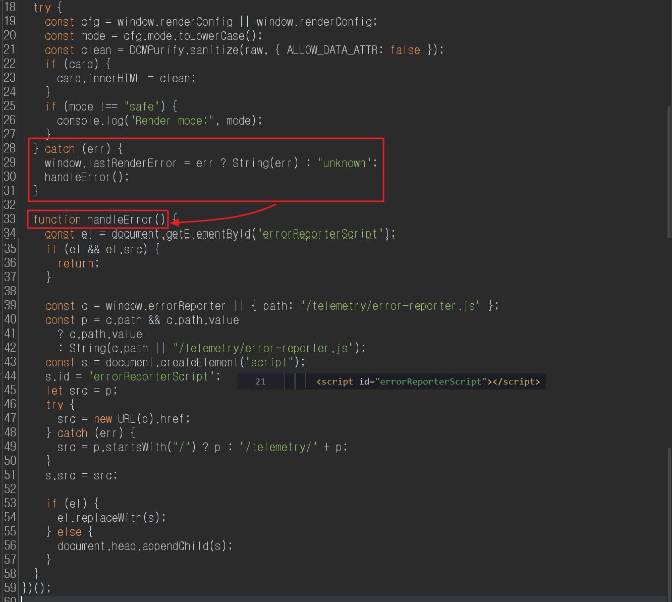 먼저 HTML 파일에 id=renderConfig 인 임의의 HTML 요소를 삽입하면, 아래 이미지에서 볼 수 있듯이 app.js 파일에서 handleError() 함수가 호출되고 웹 서버에 /telemetry/error-reporter.js 파일을 요청하여 받아오게 됩니다.