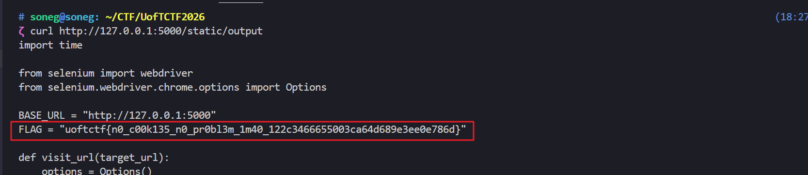 최종적으로 사용한 페이로드는 아래와 같습니다. DOM Clobbering 기법으로 공격자 서버로부터 악성 JS 파일을 받아오고, 이 JS 파일의 원격 명령 실행(RCE) 페이로드에 의해 /app/bot..py 파일이 /app/static/ 경로에 “output” 이라는 파일명으로 저장되게 됩니다. bot.py 파일에는 플래그 정보가 저장되어 있었기 때문에 이 파일 값을 읽으면 플래그 값을 획득할 수 있습니다.