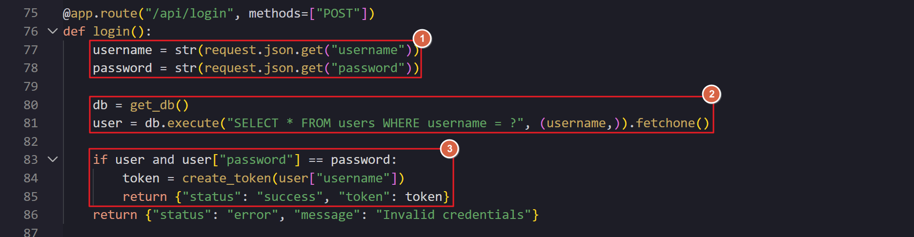 login()함수는 아래의 순서로 동작한다.- (1) POST /api/login 요청 시 입력된 파라미터(username, password)로 DB에 유효한 계정 조회
