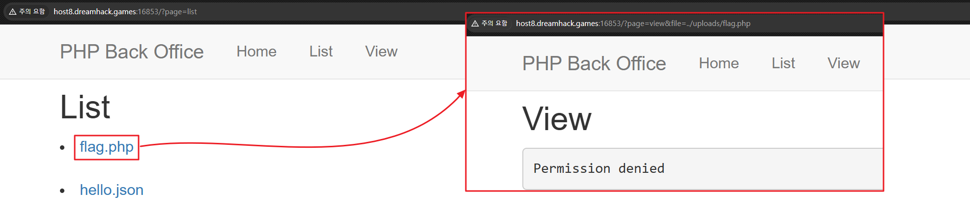 list.php에서 넘어온{$directory}{$value}값에 “flag” 문자열이 존재하면 플래그 확인이 불가했다.