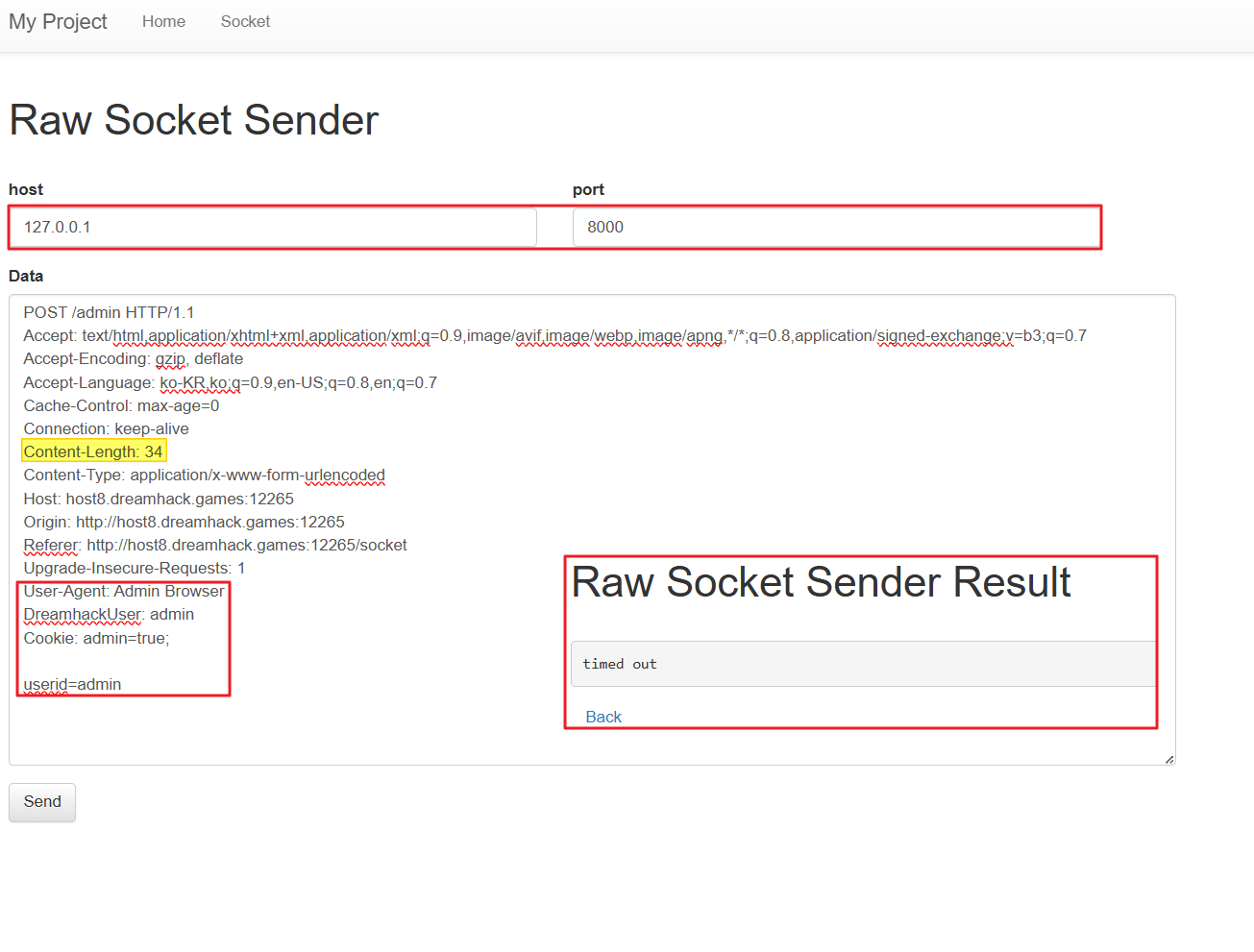 Raw Socket Sender페이지로 접속된다. - (2) 임의 값을 입력하고 전송하면 아래와 같은 형식으로 패킷이 서버로 전송된다.