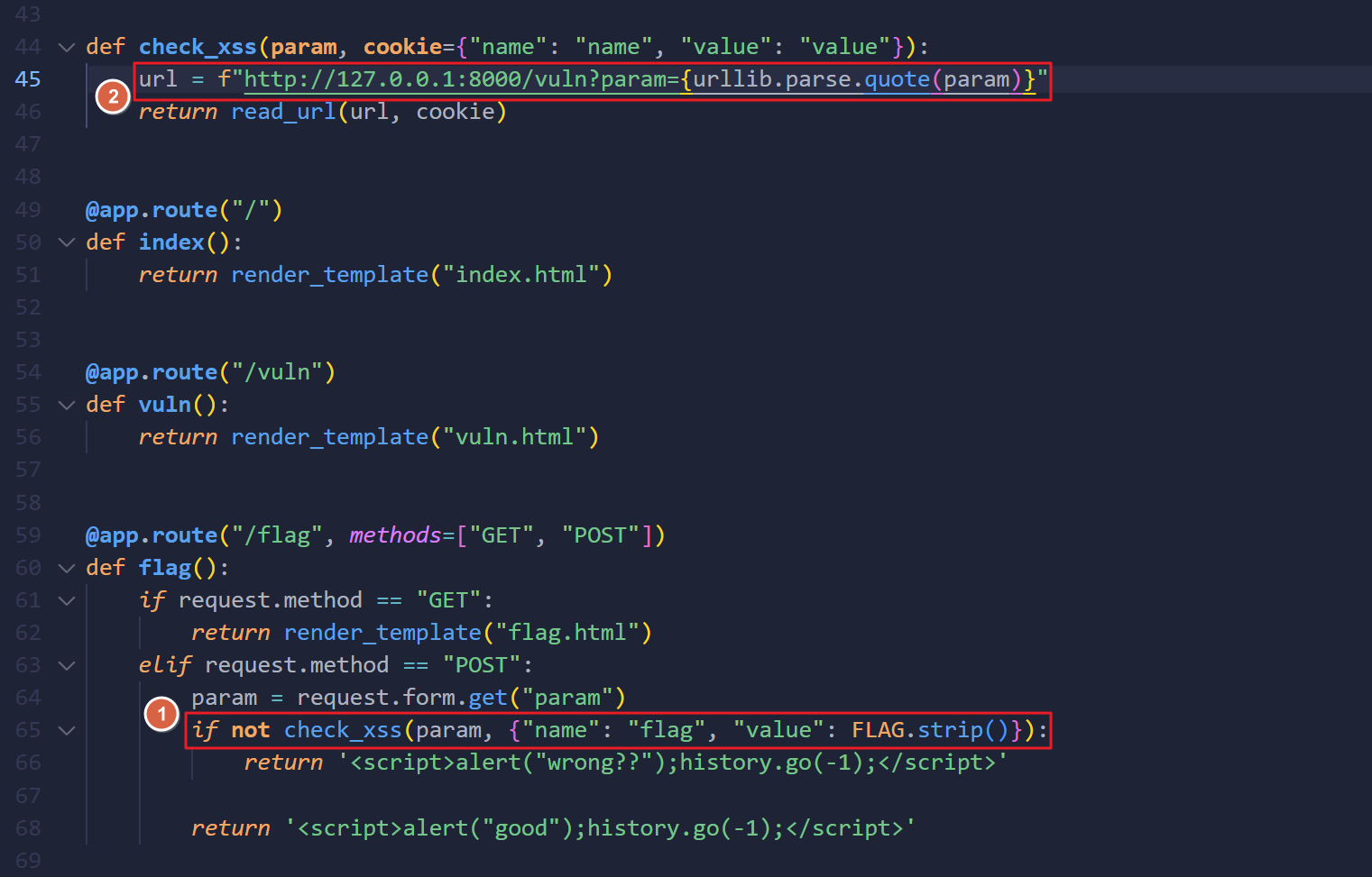 - /vuln 경로에서 Reflected XSS 취약점이 발생하는 건 확인했으니 플래그를 획득해보겠습니다.