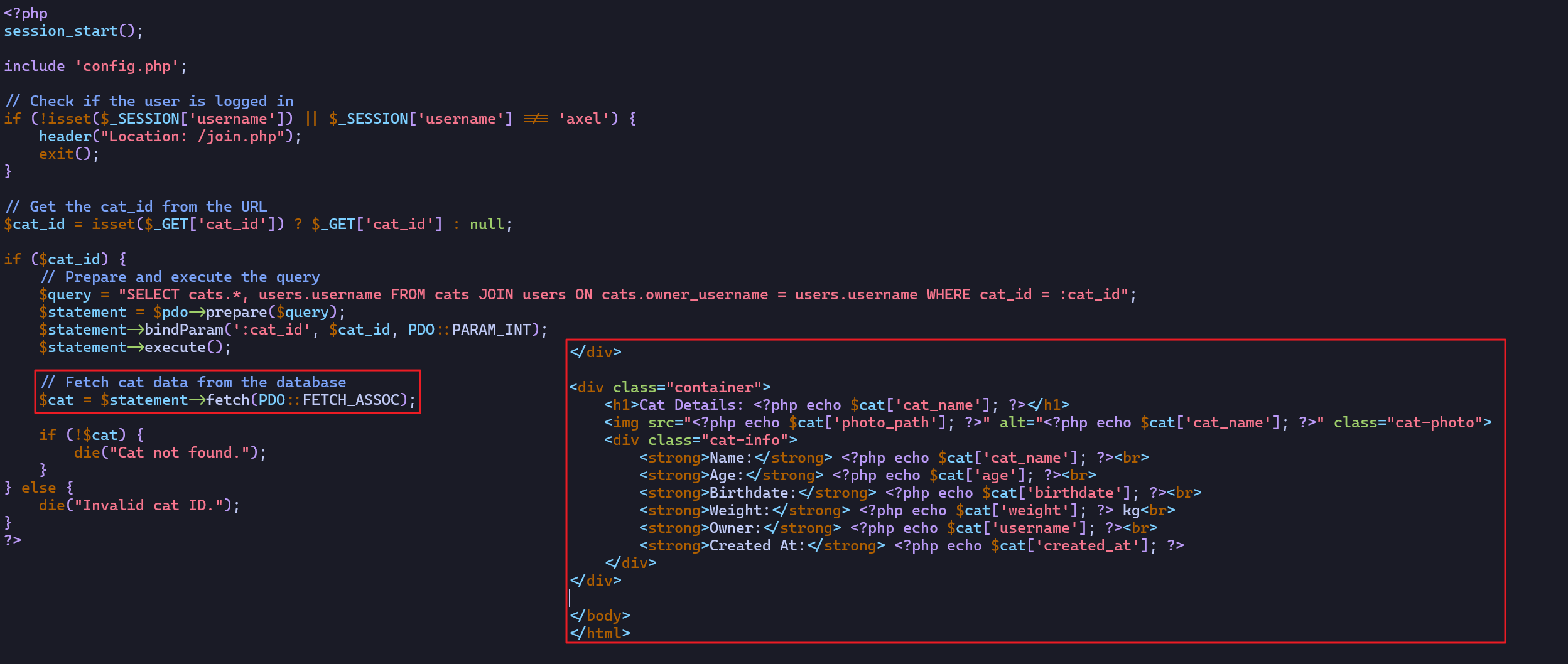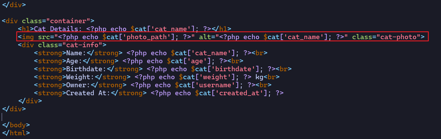 view.php파일에서는 이미지 태그를 통해 고양이 이미지 경로/고양이 이름을 불러와 화면에 출력하는 구조를 띠고 있다. 이 때,$cat['photo_path'], $cat['cat_name']값은contest.php소스를 통해 사용자가 조작 가능한 값이다.
