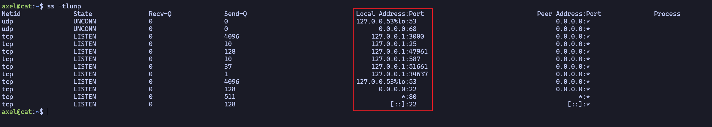 axel계정에서 리스닝 포트를 확인한 결과 22번, 80번 포트 외 다수의 포트가 내부에서 사용되고 있었다.