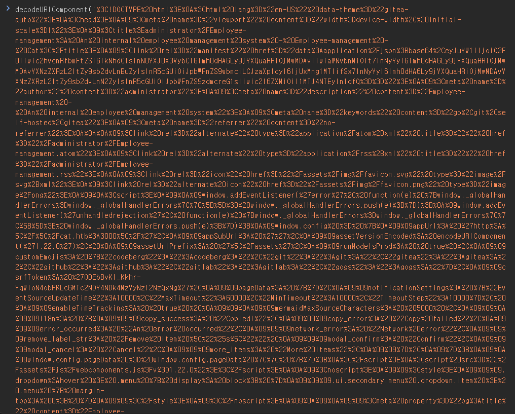 admin_repository_info파일은 encodeURIComponent 함수에 의해 인코딩 된 값이 저장되어 있으므로, decodeURIComponent 함수로 디코딩 후 값을 확인한다.