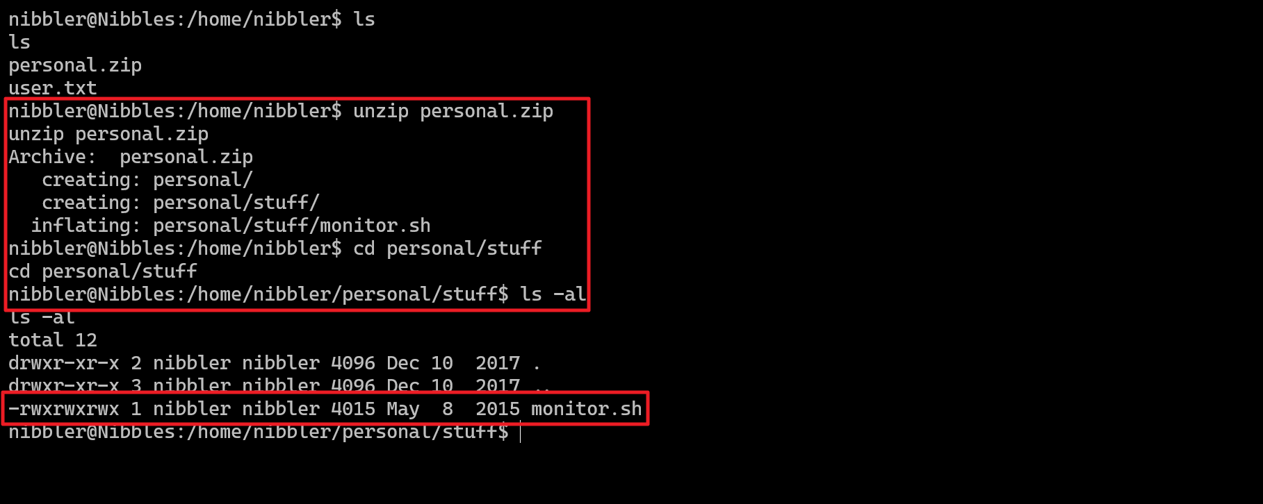nibbler 계정의 홈 디렉토리에서 personal.zip 압축파일 발견