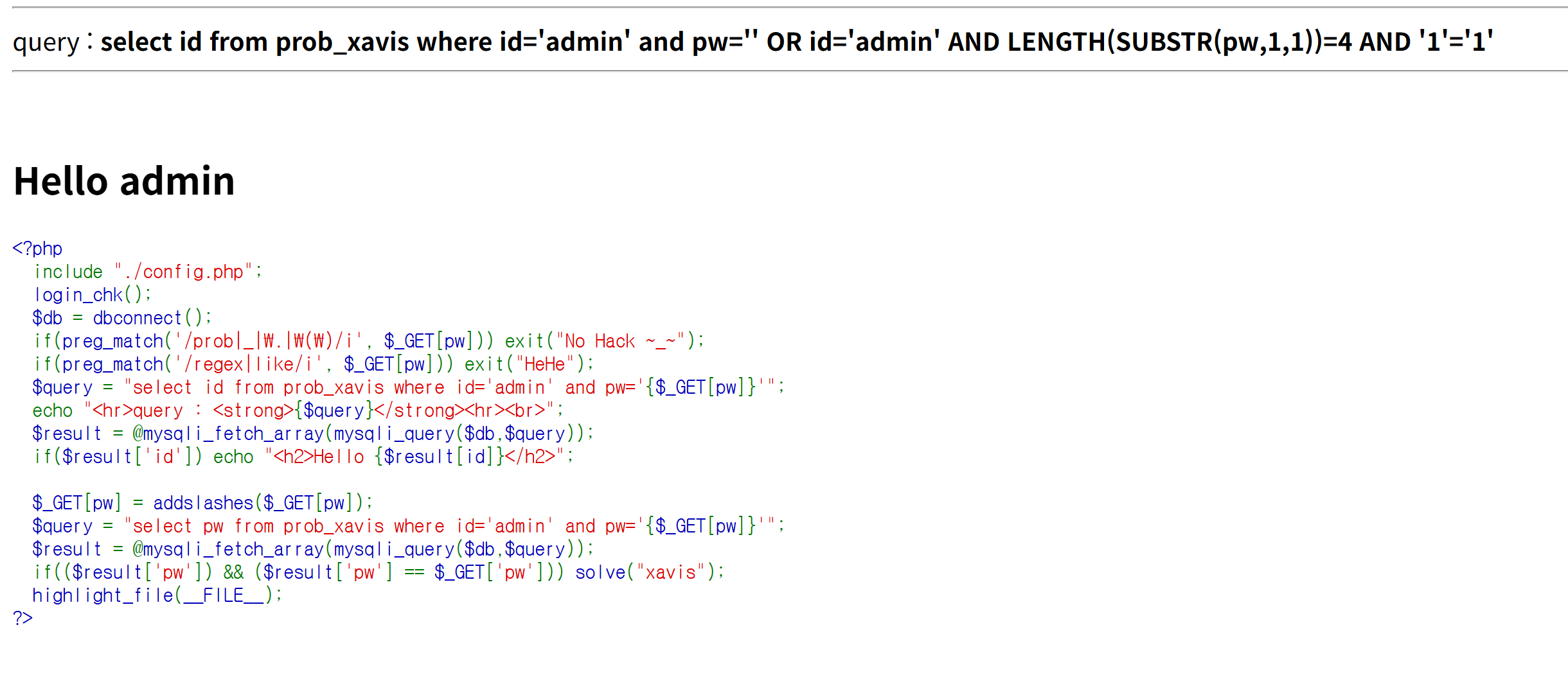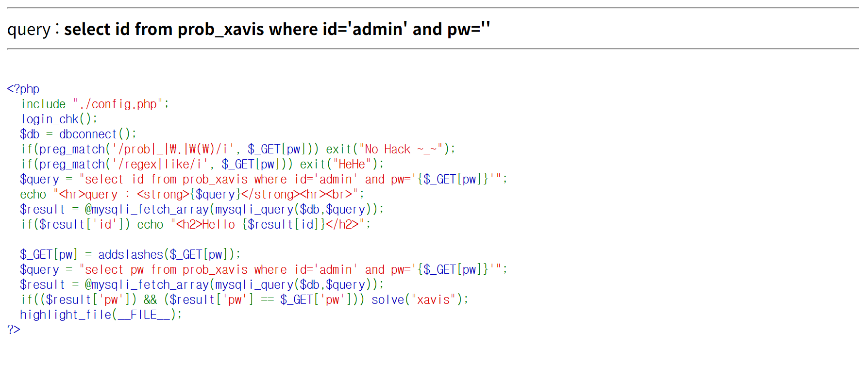 SELECT @a := prob_xavis.pw WHERE prob_xavis.id = 'admin'으로 동작한다. )