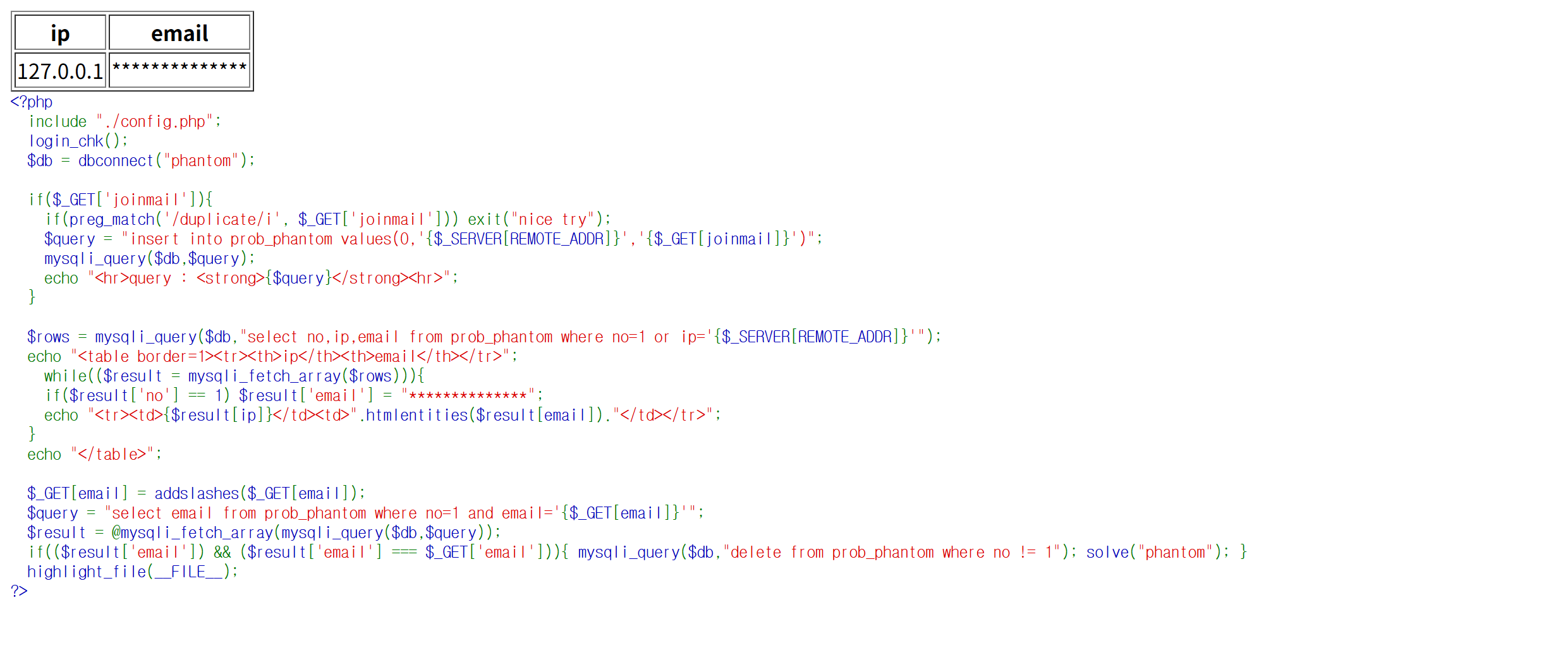 $query = "select email from prob_phantom where no=1 and email='{$_GET[email]}'";