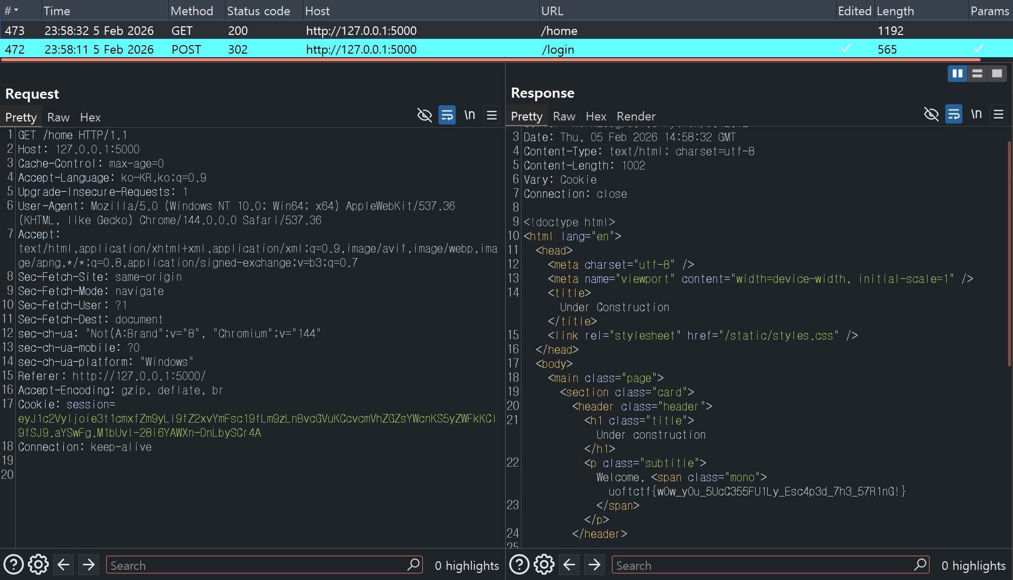 로그인 성공 후 /home 경로로 리다이렉트 될 때 요청 헤더에 플래그 파일의 경로를 담아 함께 보내면 플래그가 출력됩니다.