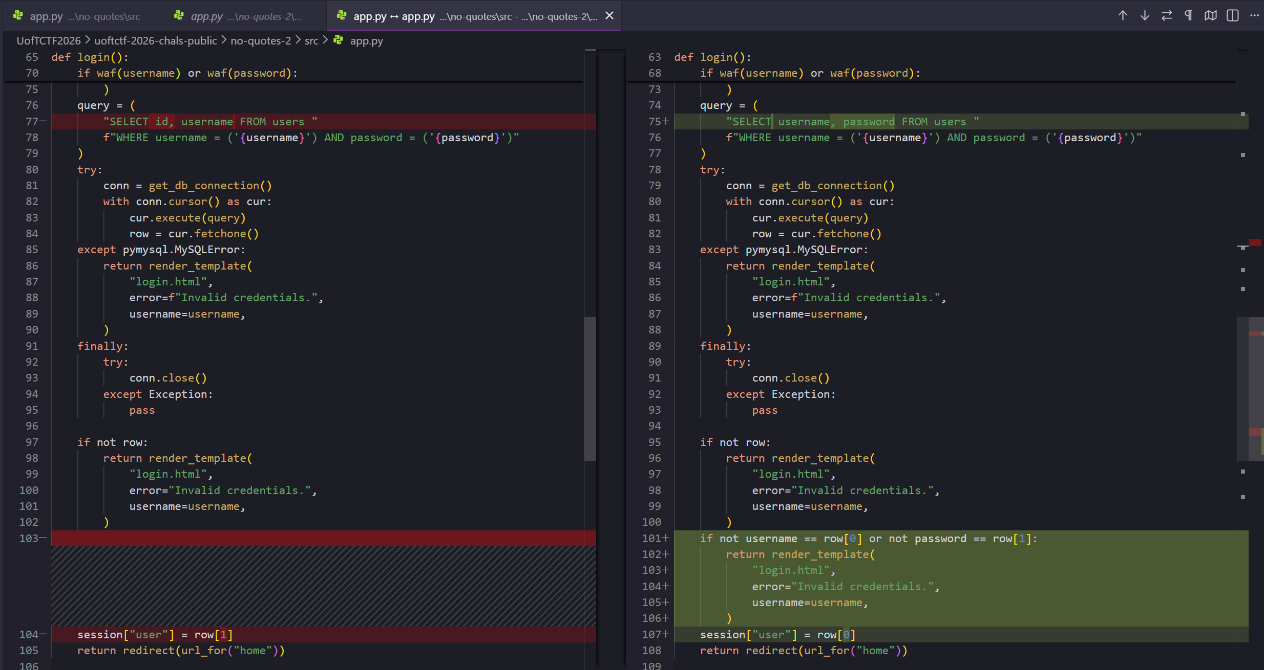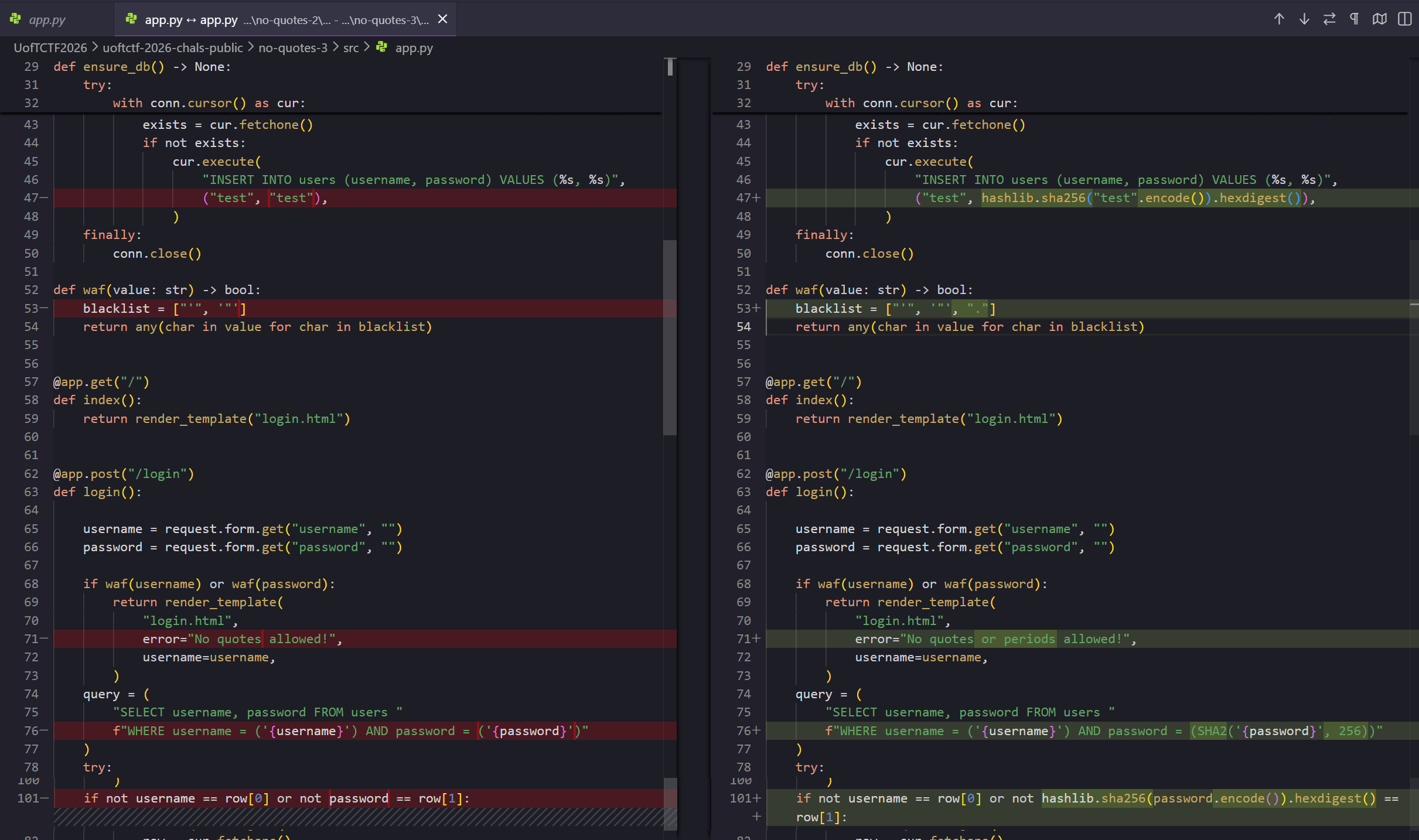 return any(char in value for char in blacklist)취약한 쿼리문은 아래와 같았는데, 유저명과 패스워드 모두 홑따옴표(Single Quote)로 감싸져 있었기 때문에