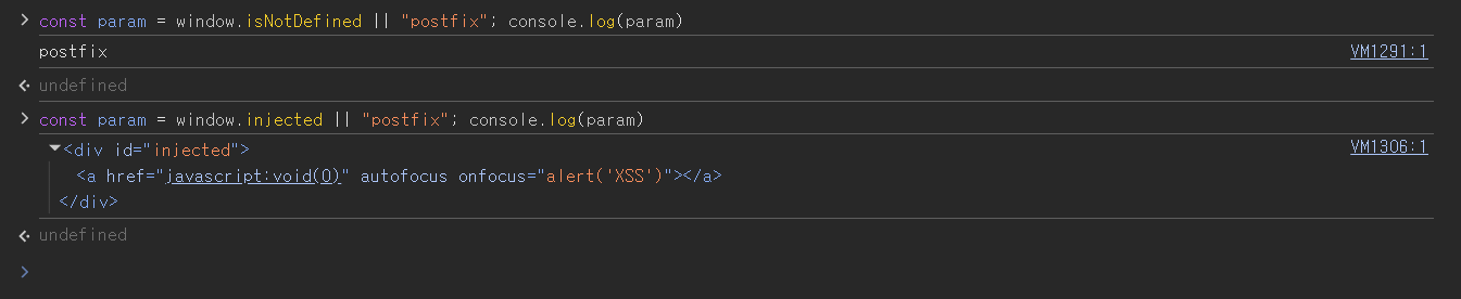 const mode = cfg.mode.toLowerCase();예를 들면, HTML 문서로부터 존재하지 않는 HTML Element id 값을 가져오려고 하면 선행 연산에서 “undefined” 값이 반환되므로 후행 연산의 결과(“postfix”)를 반환합니다. 반대로, id=injected 인 HTML Element 가 존재하면 선행 연산 결과를 리턴하고 후행 연산은 생략됩니다.
