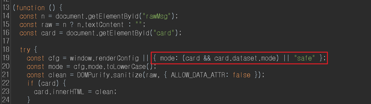 먼저 첫 번째로 취약한 구간은 아래 부분입니다. view.html 파일에는 id 값이 renderConfig 인 HTML 요소가 없기 때문에 cfg 상수에는 { mode: (card && card.dataset.mode) || "safe" }; 값이 할당됩니다. 그런데, 만약 공격자가 view.html 파일에 HTML Injection 을 수행하여 id=renderConfig 인 임의의 HTML 요소를 넣는게 가능하다면 cfg 상수에는 window.renderConfig 값이 할당됩니다.