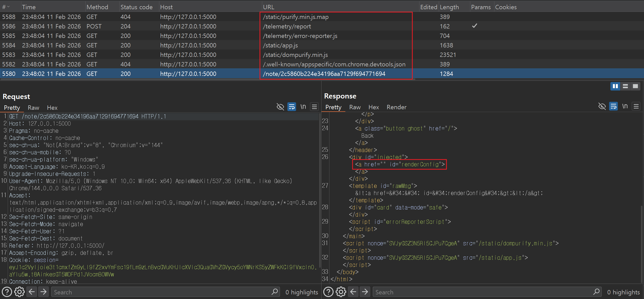 먼저 HTML 파일에 id=renderConfig 인 임의의 HTML 요소를 삽입하면, 아래 이미지에서 볼 수 있듯이 app.js 파일에서 handleError() 함수가 호출되고 웹 서버에 /telemetry/error-reporter.js 파일을 요청하여 받아오게 됩니다.