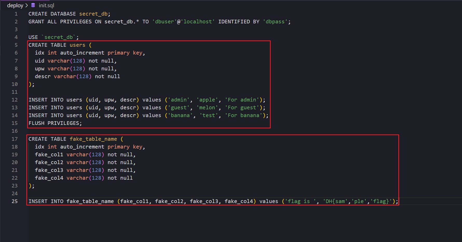 DB 테이블에 값을 삽입하는 코드입니다. users, fake_table_name 테이블에 각각 임의의 값을 추가하고 있네요.