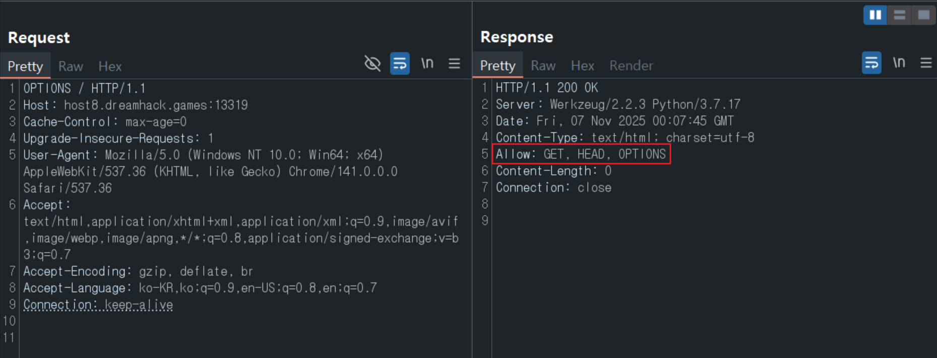 - OPTIONS 메서드로 서버에 요청을 보내면 허용된 HTTP 메서드를 확인할 수 있다.