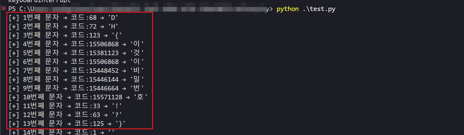 print(f"[+] {i}번째 문자 → 코드:{real_val} → '{char}'")