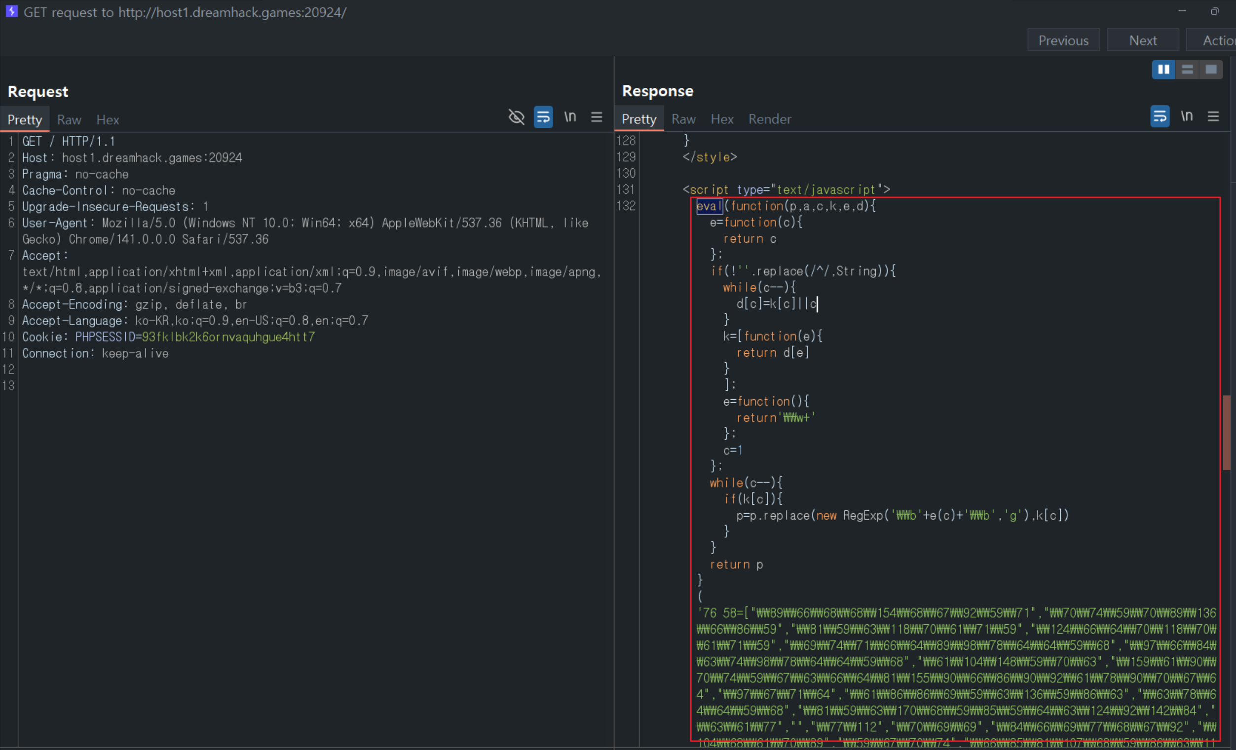 - / 경로로 접근하여 얻은 응답을 확인해보면, 스크립트 태그 내부에 난독화된 값이 존재했다.