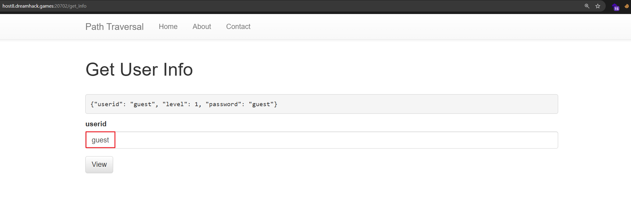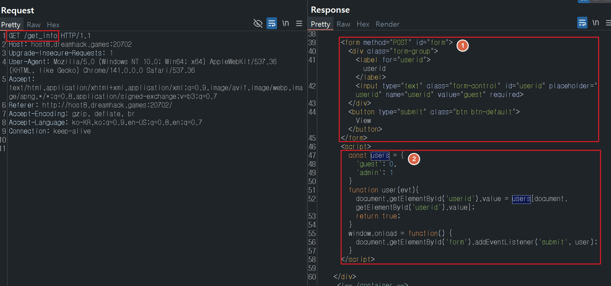 get_info경로로 POST 요청을 보내는데, 이 때userid파라미터가 함께 전달 userid파라미터는 입력 폼에 입력된 값에 따라 0 혹은 1 값으로 설정- guest : 0 / admin : 1