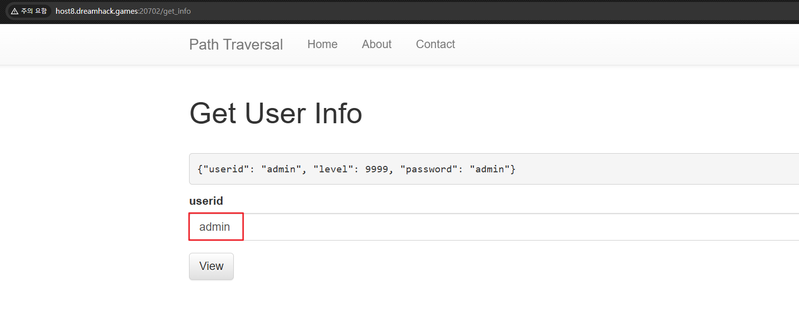 admin입력 후View버튼 누르면 서버로부터 아래와 같은 응답이 옵니다.