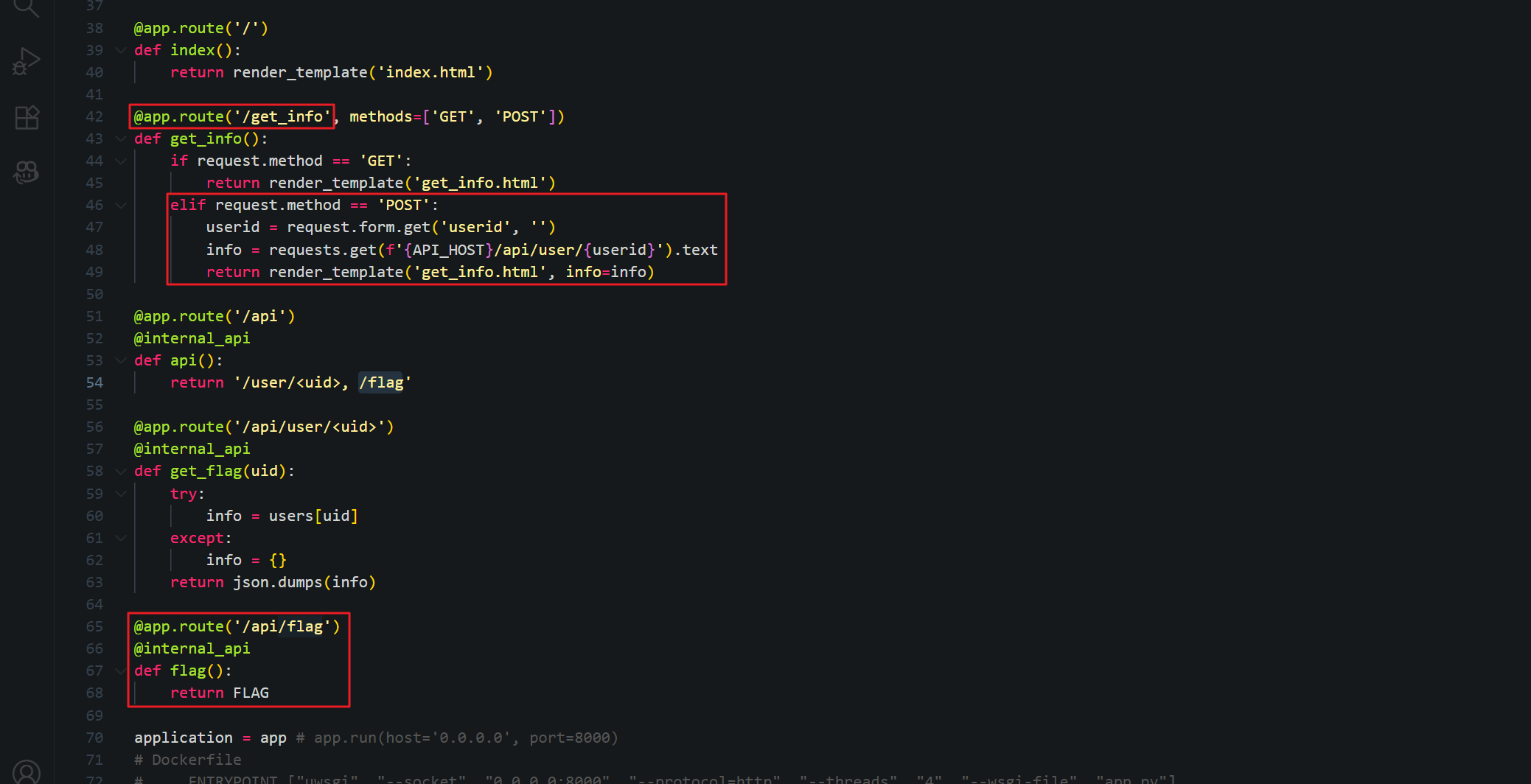 /api/flagAPI를 호출하는 것은 불가(401)하지만get_info로 POST 요청은 가능합니다. - 따라서, POST 요청 시에