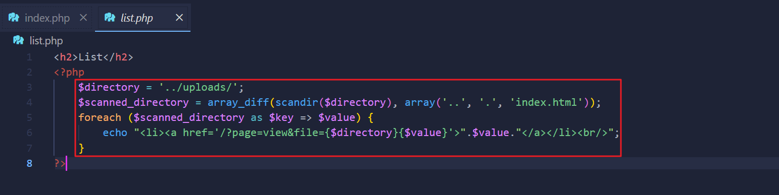 ../uploads/폴더를 스캔하여,.., ., index.html파일을 제외한 파일들에 대한 링크들을 출력한다./?page=view&file={$directory}{$value}