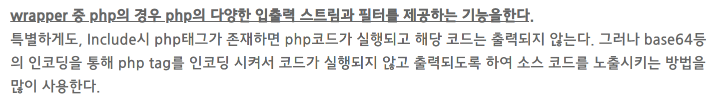 <?php ... ?>코드는 실행되나 출력은 되지 않는다. - PHP WRAPPER로 BASE64 인코딩 처리하면 PHP 코드가 아닌 일반 텍스트처럼 인식되므로 소스코드 확인 가능하다.