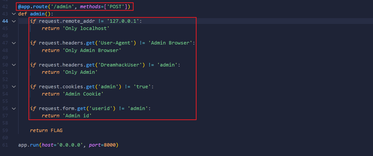 - admin 경로로 POST 요청이 들어오면, 전달 받은 값을 5번 검증(if (…))하고 플래그를 출력하고 있다.