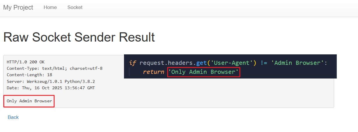 - “Only Admin Browser” 메시지가 출력되었으며, 해당 출력 값은 admin() 함수의 2번째 값 검증 구간이었다.