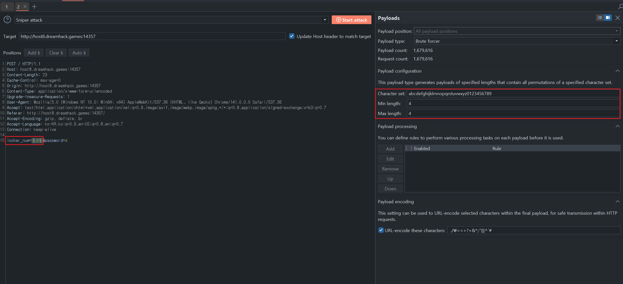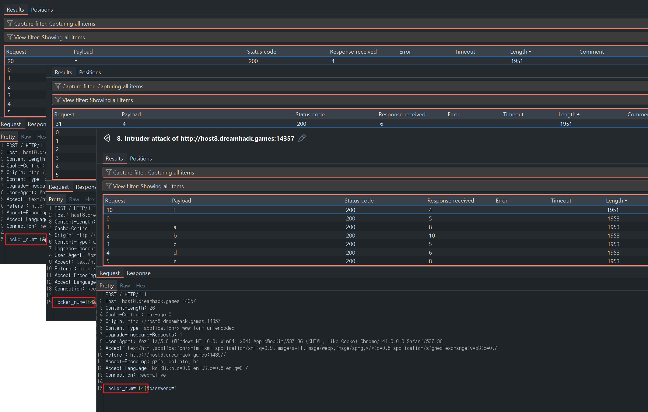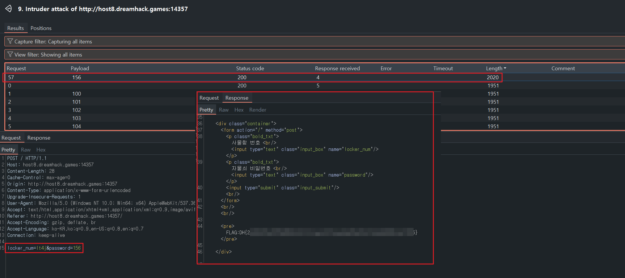 locker_num값이 정확하게 랜덤 문자열 4개와 일치해야 하고, - (2) 패스워드도 100~200 중 일치하는 값을 찾아야 합니다.