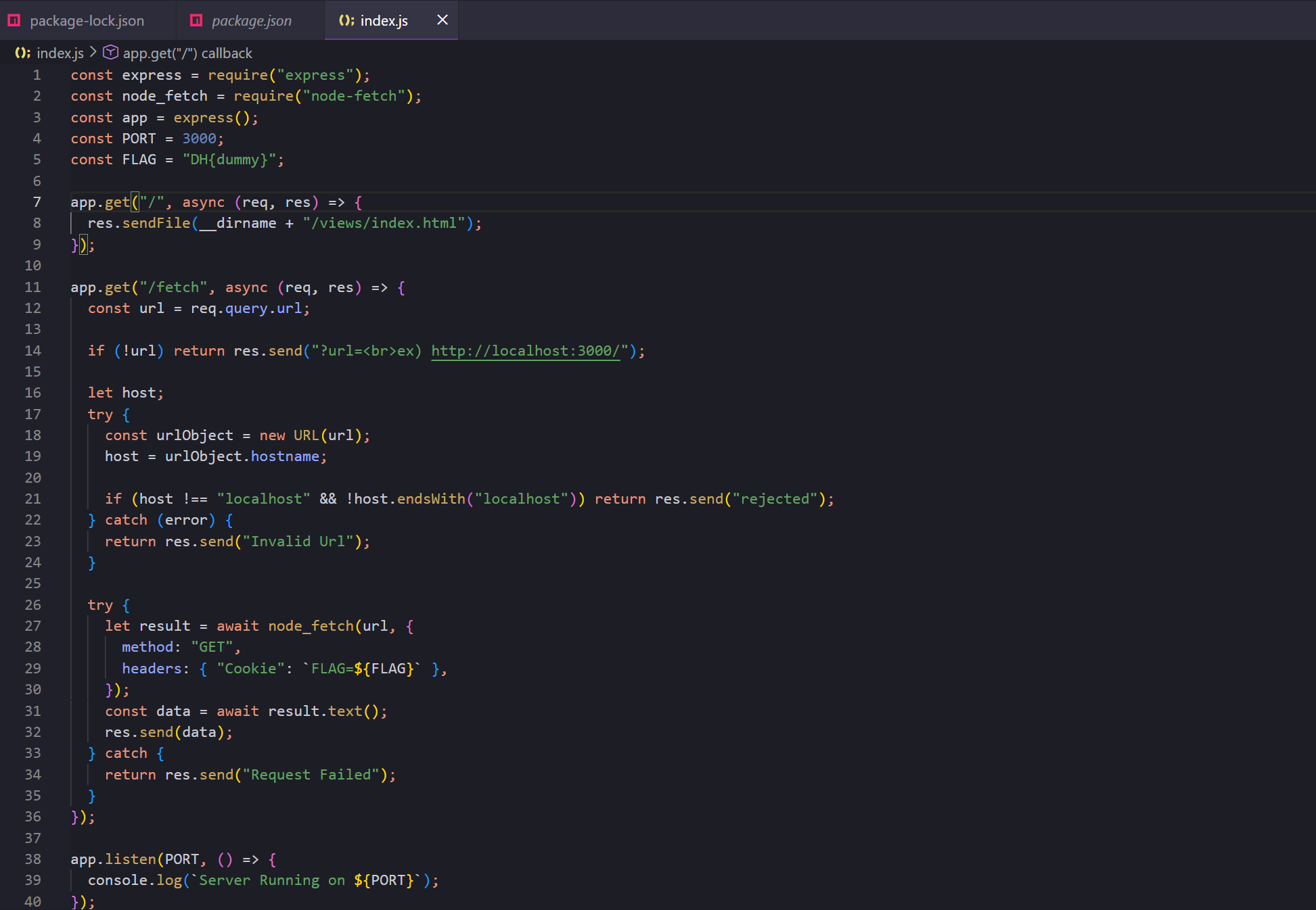 url파라미터에 전달받은 값이 검증을 통과하면 서버는 입력된 url 경로로 요청을 보내는데, 이 때 요청 헤더에 플래그 값이 함께 전달됩니다. 그러므로 요 헤더 값을 탈취하는게 궁극적인 목표라고 할 수 있겠네요.