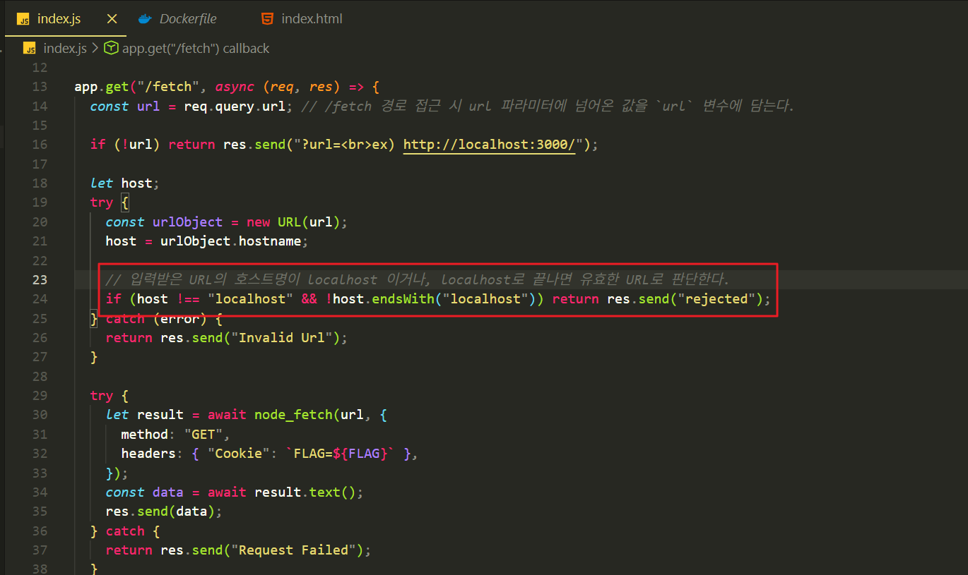 url파라미터 값을url변수에 저장하고, URL 인스턴스를 하나 생성해서 호스트명을host변수에 저장하고 있습니다. 이 때, 호스트(host) 값은localhost이거나,localhost로 끝나는 임의의 값이어야 합니다.- 만약 그렇지 않으면 서버로부터 “rejected” 혹은 “Invalid Url” 응답이 반환됩니다.