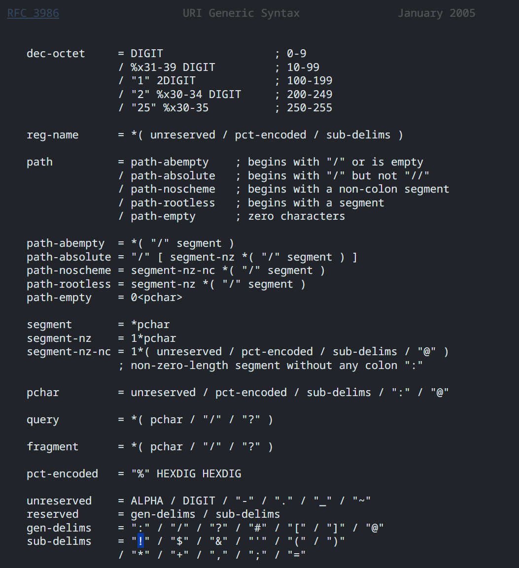 url파라미터에 입력된 (1) URL의 호스트명이localhost이거나, (2) URL이localhost로 끝나야 합니다. 여기서 플래그를 확인하기 위해서는 반드시 리퀘스트빈으로 요청을 보내야 하기 때문에 (1) 을 우회할 수는 없습니다. - 그럼 (2)를 우회해야 하는데요. RFC 3986(URI 표준)에서는 호스트 부분에서 허용되는 문자들을 정의하고 있습니다.